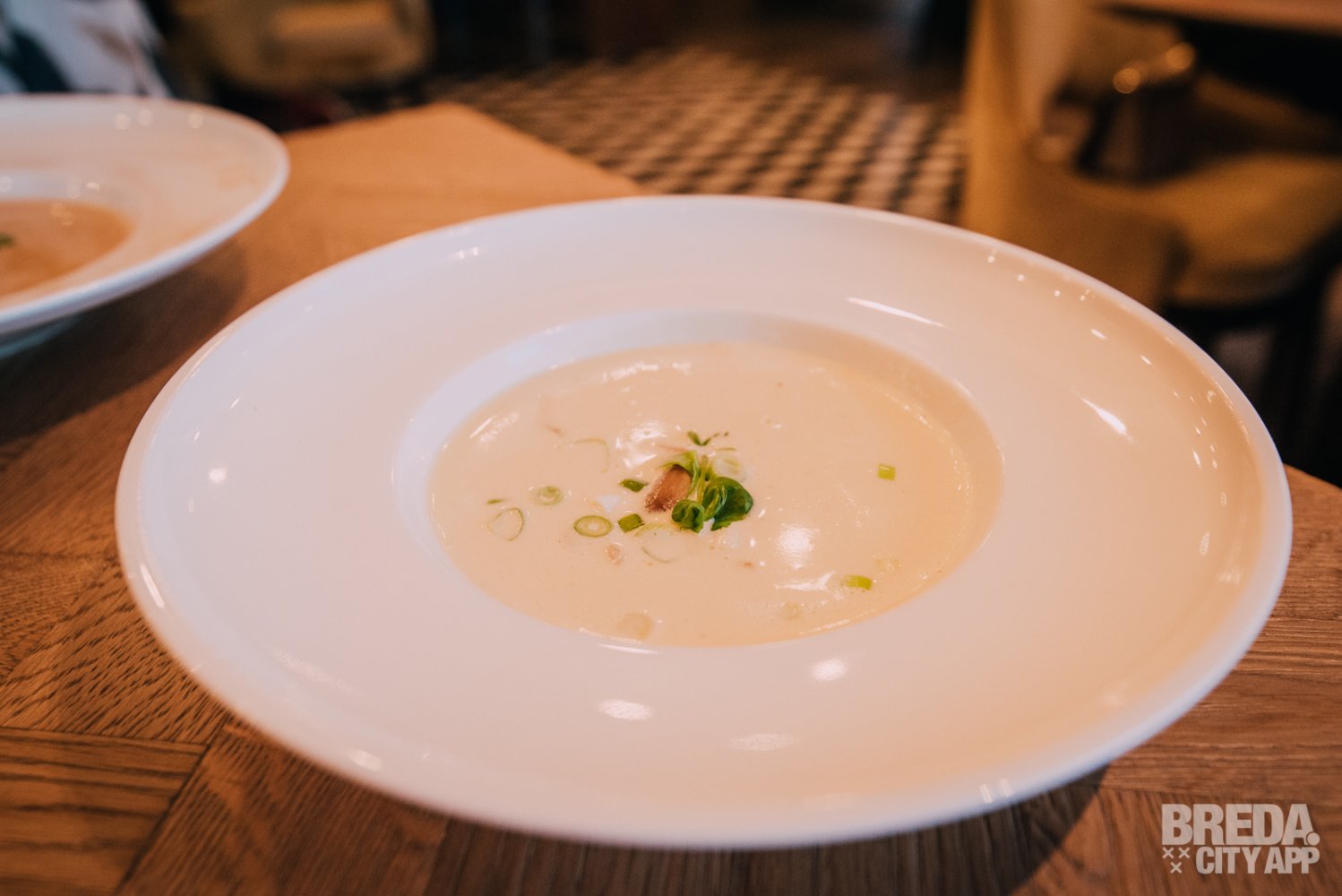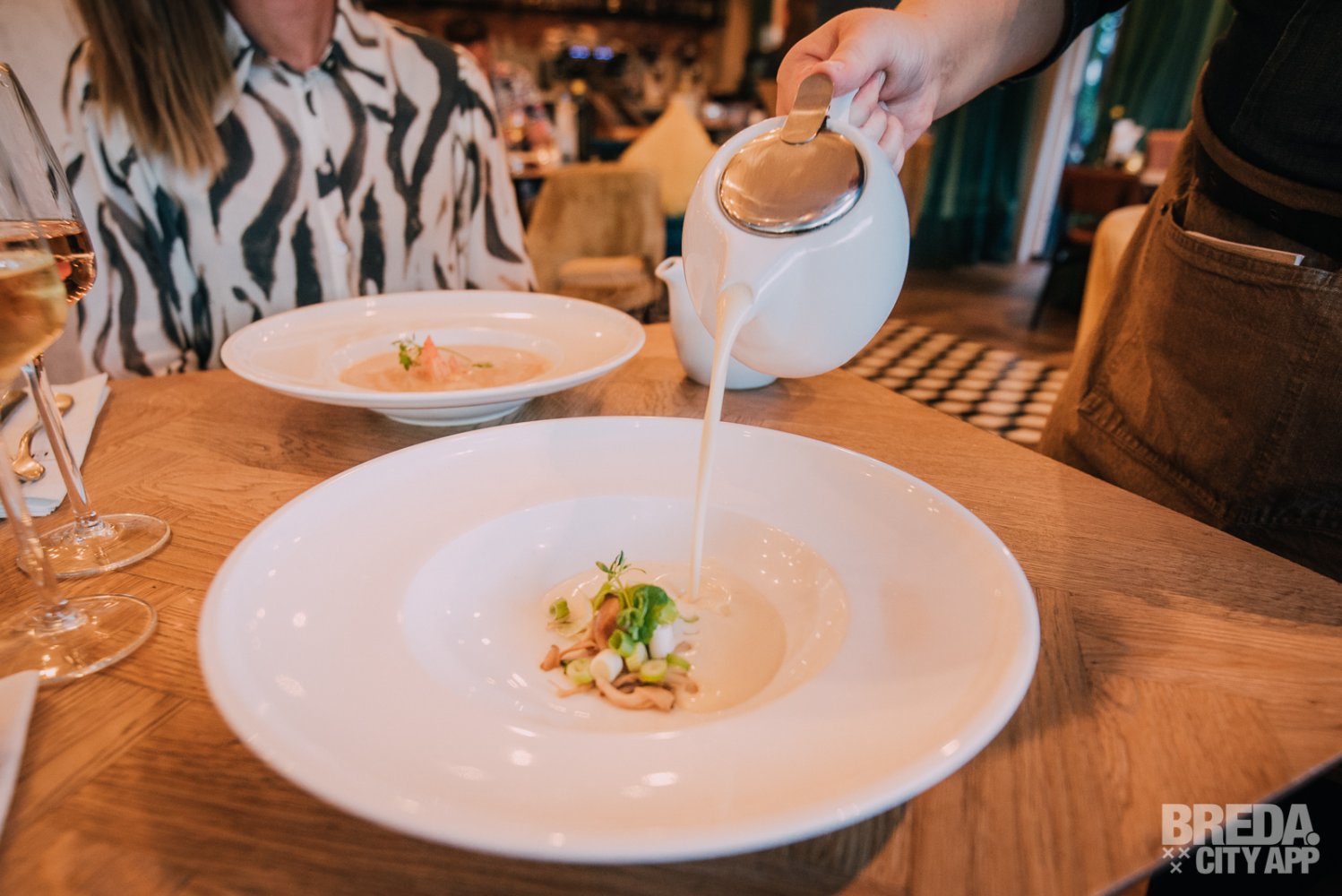 De romige Thaise tom kha kai, kokossoep met citroengras, gember, bosui en paddenstoelen wordt geserveerd met een heerlijke Viognier. Deze Viognier van Croix d'or is niet alleen favoriet van de medewerkers van de Veestallen, maar valt bij ons ook in de smaak. Het is een mooie Franse wijn met aroma's van tropisch fruit, is vol van smaak, bloemig én heeft een zachte afdronk. Beide soepen smaken heerlijk en worden mooi aan tafel opgeschonken. De tom kha kai is echter door de combinatie van romig en fris onze favoriet! Deze is overigens, in tegenstelling tot veel restaurants, helemaal vega zonder kip. Voor ons een grote plus!