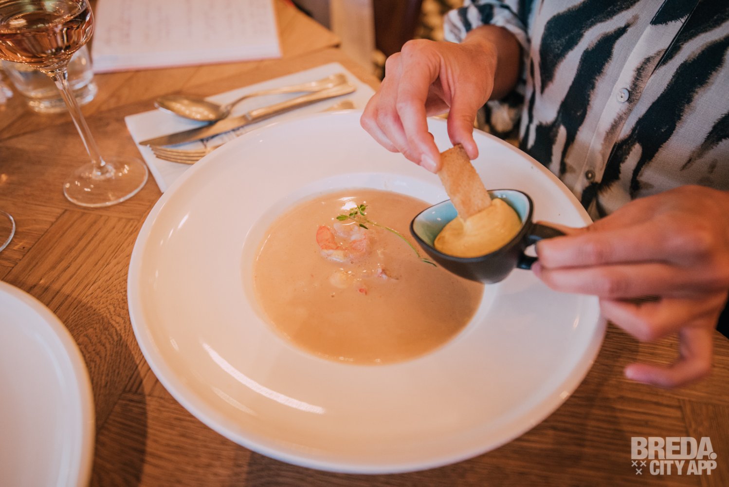 Ook het tussengerecht die bestaat uit 2 soepjes: een tom kha kai en een bisque wordt geserveerd met bijpassende wijnen. De mooie Bisque, ‘schaaldieren soep’, is gegarneerd met gamba, rivierkreeft, forel ei, kruidenolie gecombineerd met een rouille en kruiden toast. De Pink Heron rosé die hierbij geserveerd wordt zit niet alleen in een prachtige fles, maar deze volle rosé met een klein zuurtje en tonen van framboos, bosbes en een beetje sinaasappel matcht goed bij de bisque.