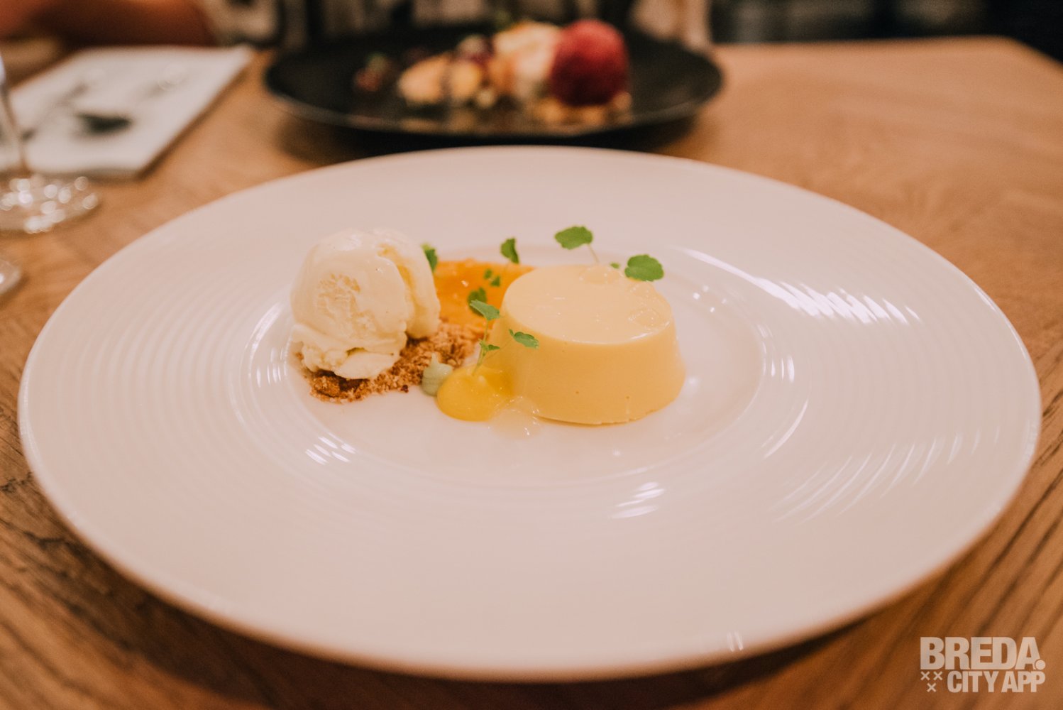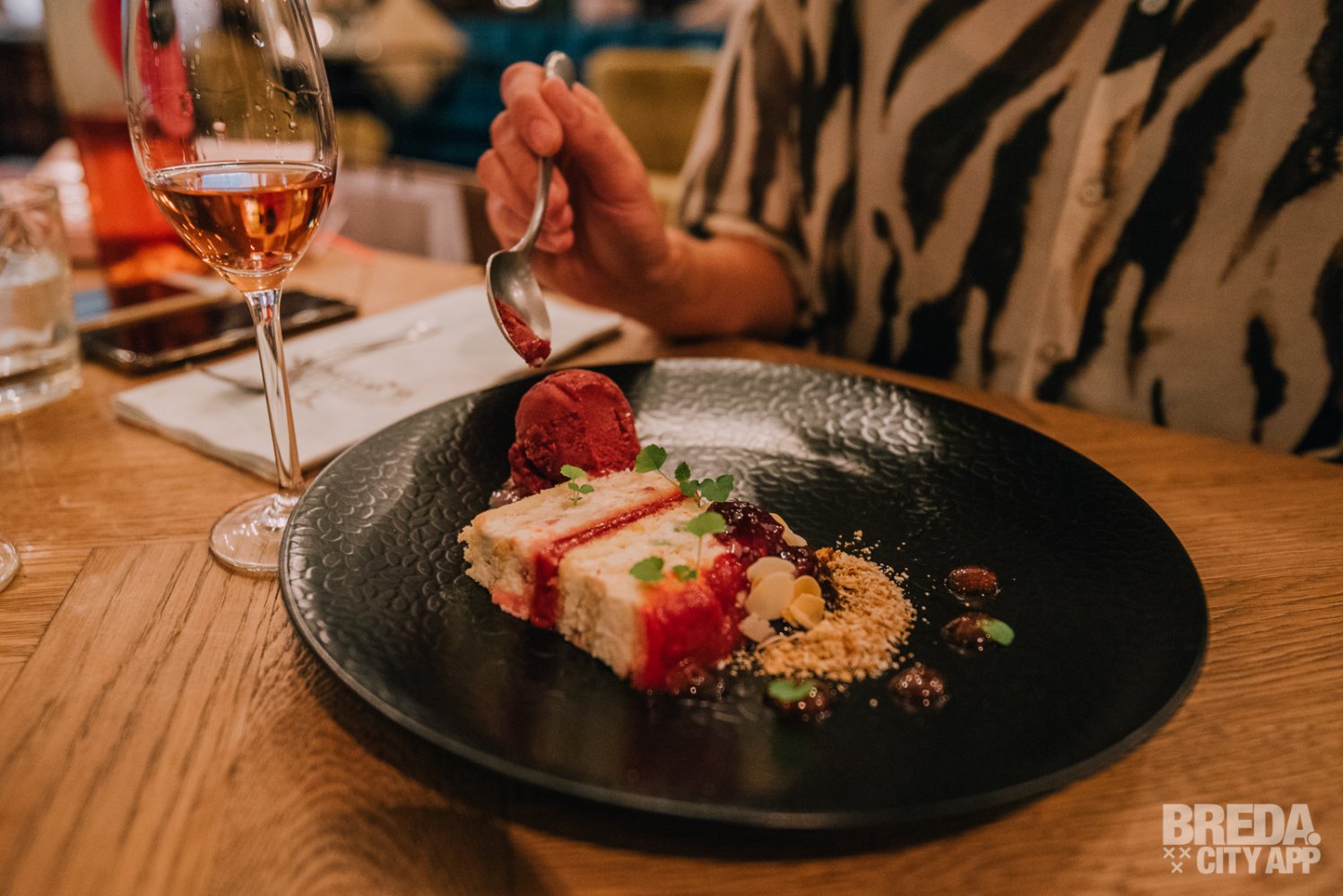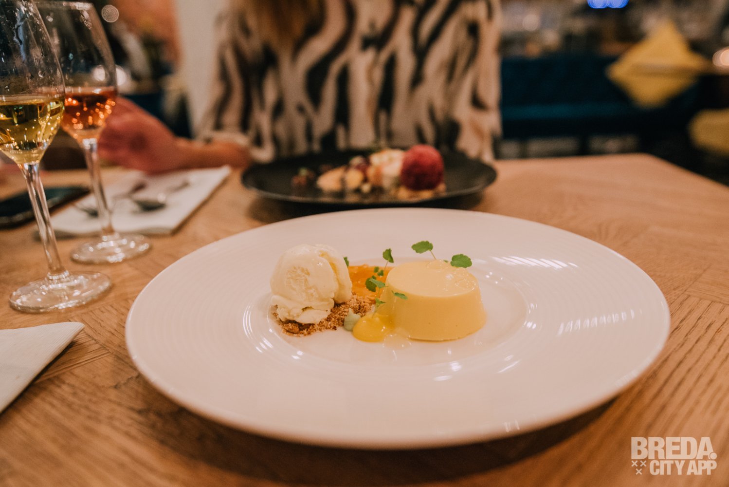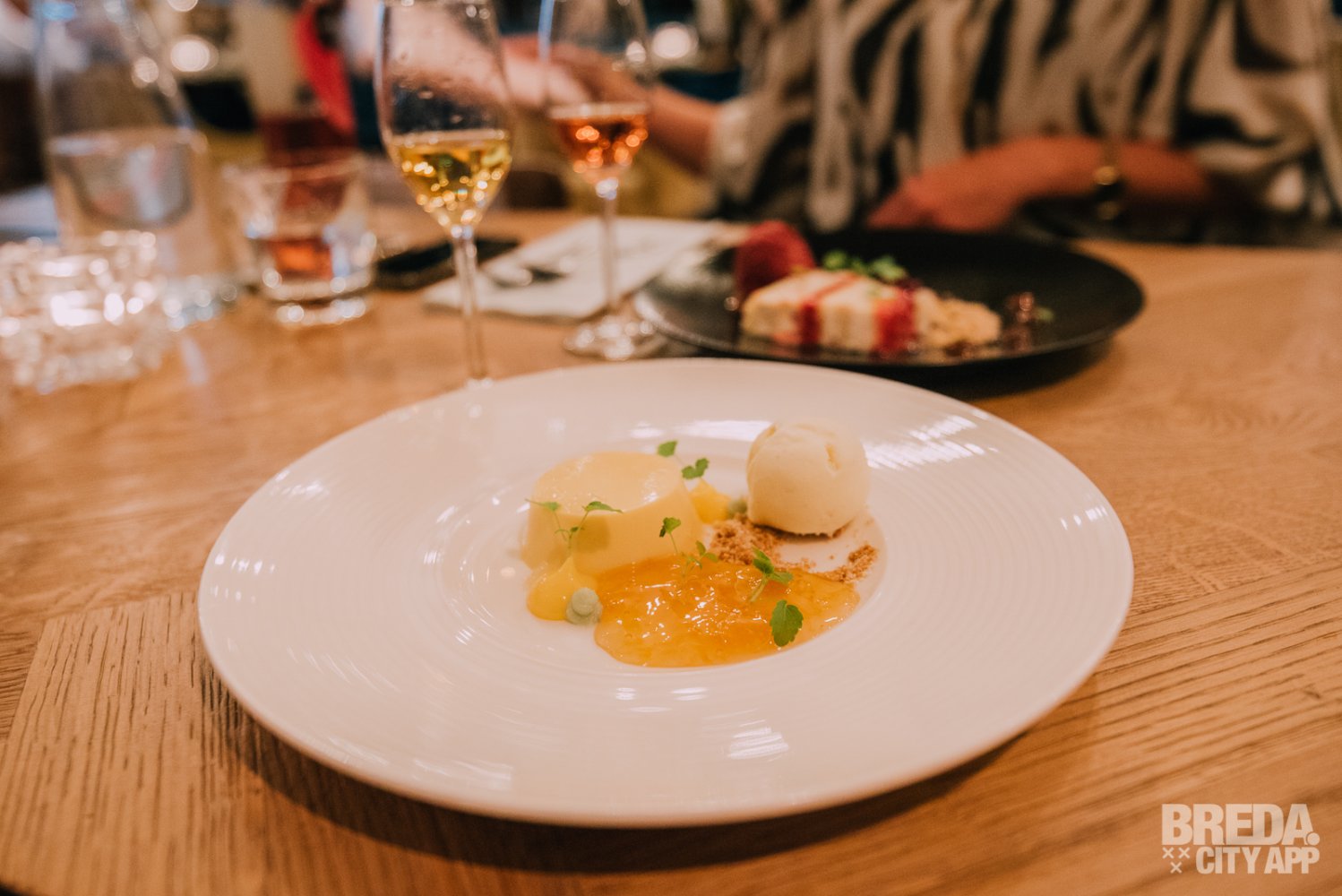 Als afsluiter van deze top avond zijn we bij de desserts aangeland. We kunnen het niet laten om ook bij deze gang een bijpassend dessertwijntje te nemen, de avond gaan we in stijl afsluiten. En hoe?! Wij krijgen een cremeux van sinaasappel met schotsen pure choco, yoghurt krokant en gekonfijte sinaasappel. Het andere dessert is Siciliaanse cassata. Deze gelaagde Italiaanse taart (cake, gezoete ricotta, marsepein, gekonfijt fruit en slagroom) wordt begeleid door cranberry, abrikoos en pistache ijs. De dessertwijnen die hierbij worden geschonken zijn een fris zoete Port van Martha’s en een volle zoete Dona Dolce Moscatel dessertwijn. Beide passen ze uitstekend bij de desserts!