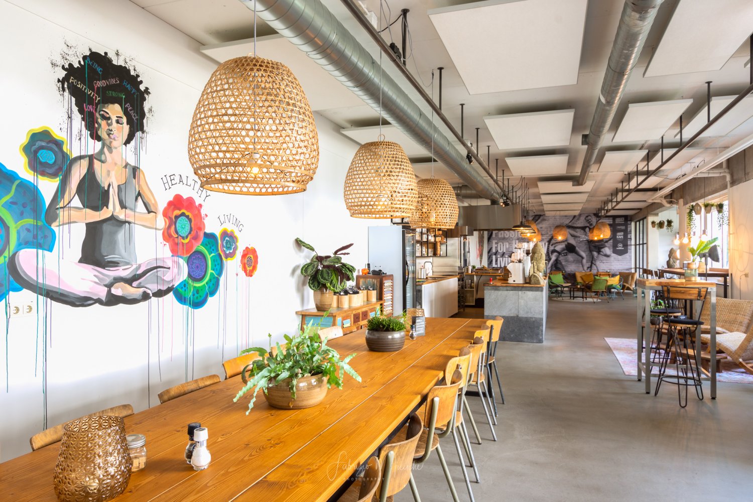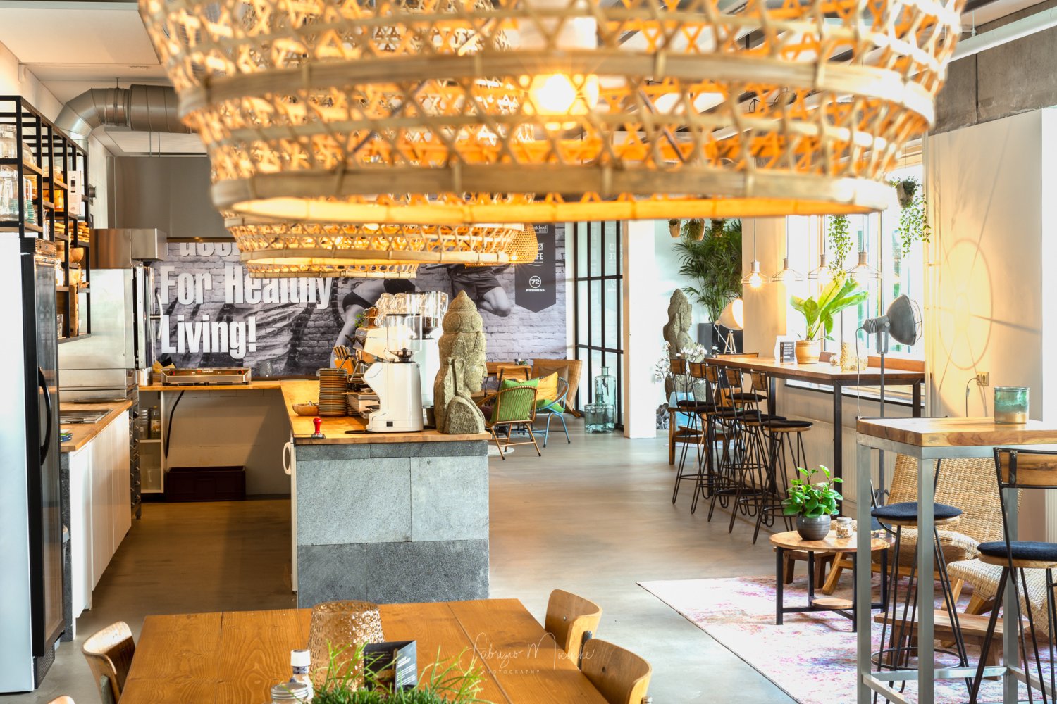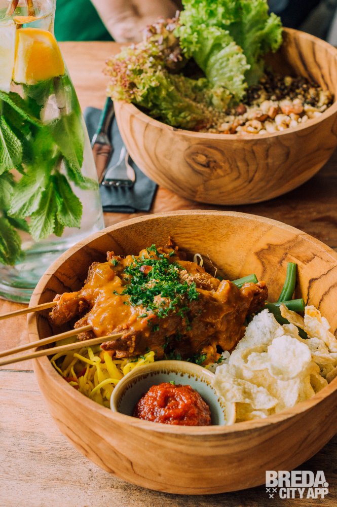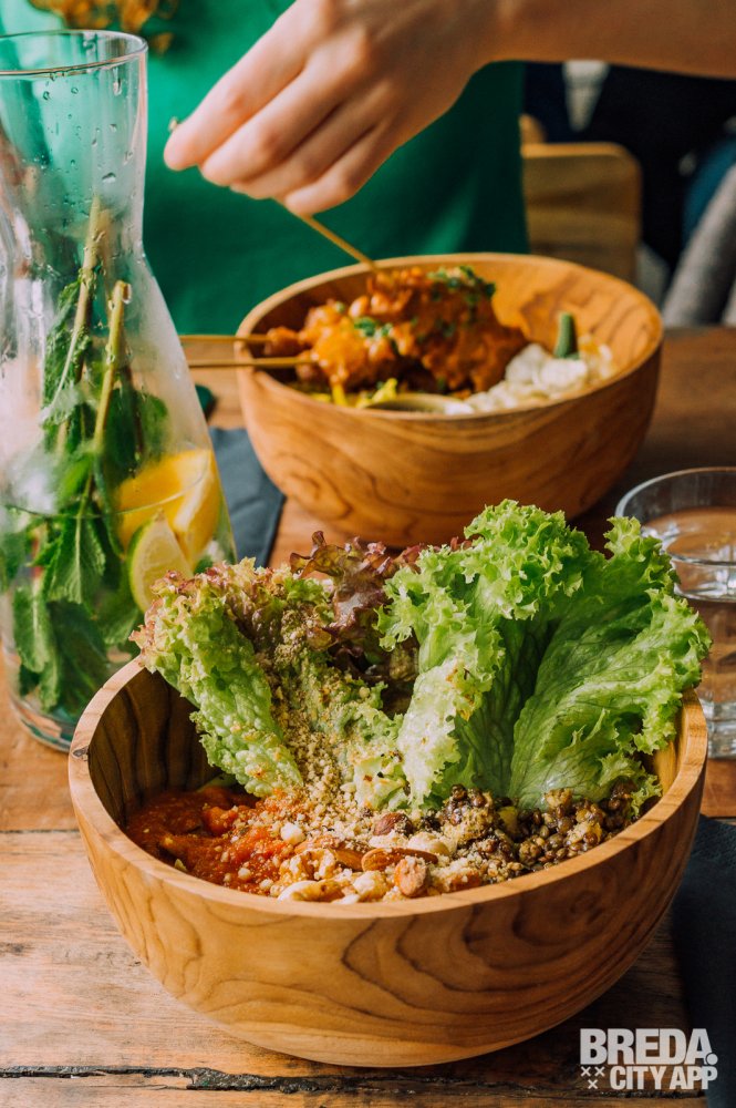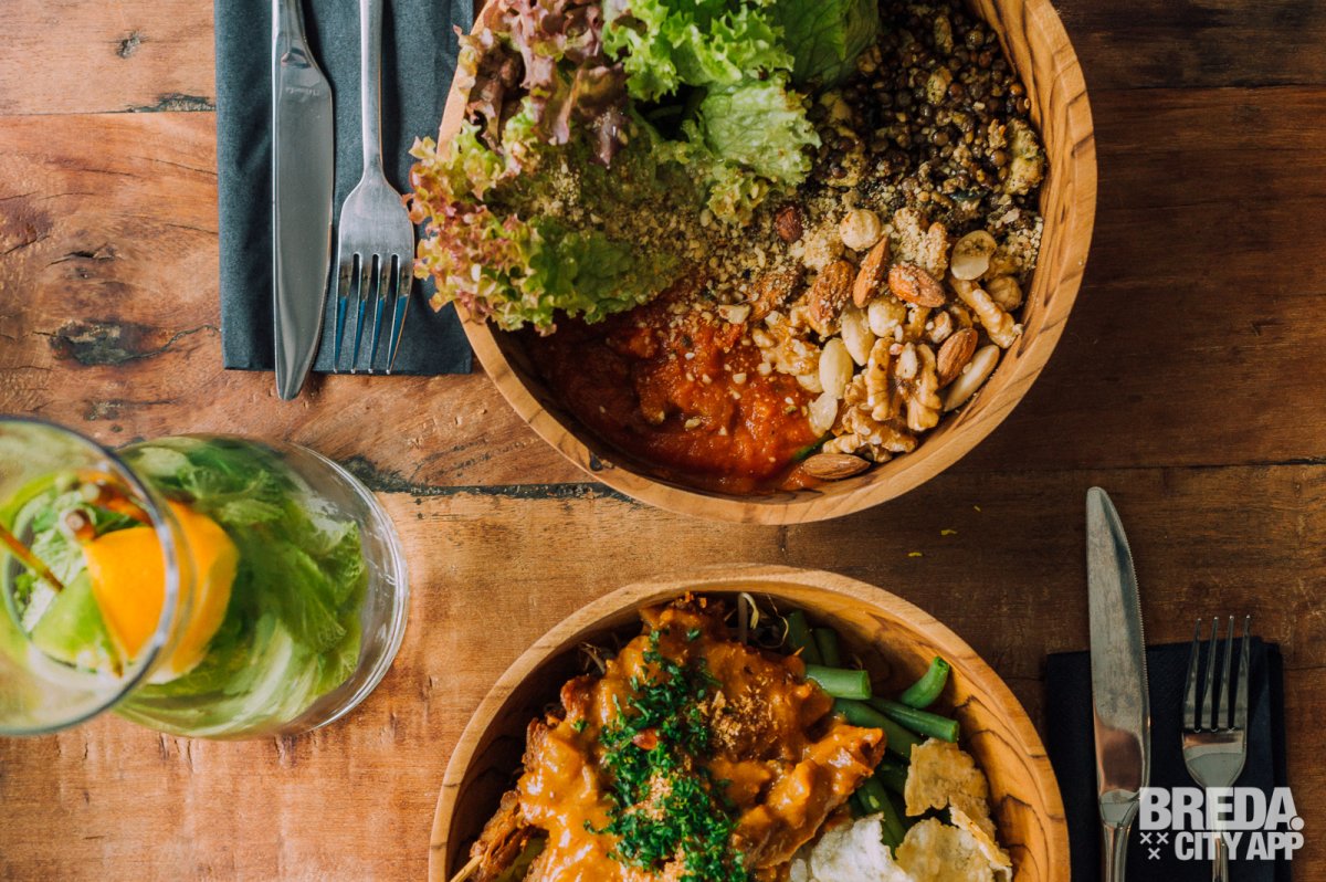 Bij binnenkomst lijkt het of ik een andere wereld binnenwandel. Wat een fijne, rustgevende sfeer. De inrichting is een mix van industrieel met Balinese invloeden, een aparte combi die ik niet eerder zo heb gezien. In het midden bevindt zich de open keuken met daaromheen verschillende zithoekjes, van lage lounge stoelen tot hoge bartafels. We worden vriendelijk begroet door de serveerster die ons laat plaatsnemen aan een tafeltje bij het raam. Vanuit hier hebben we uitzicht op de CityGarden, waar je buiten in het zonnetje lekker kunt genieten van dezelfde ontspannen sfeer.