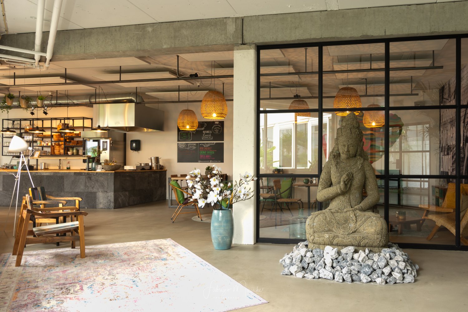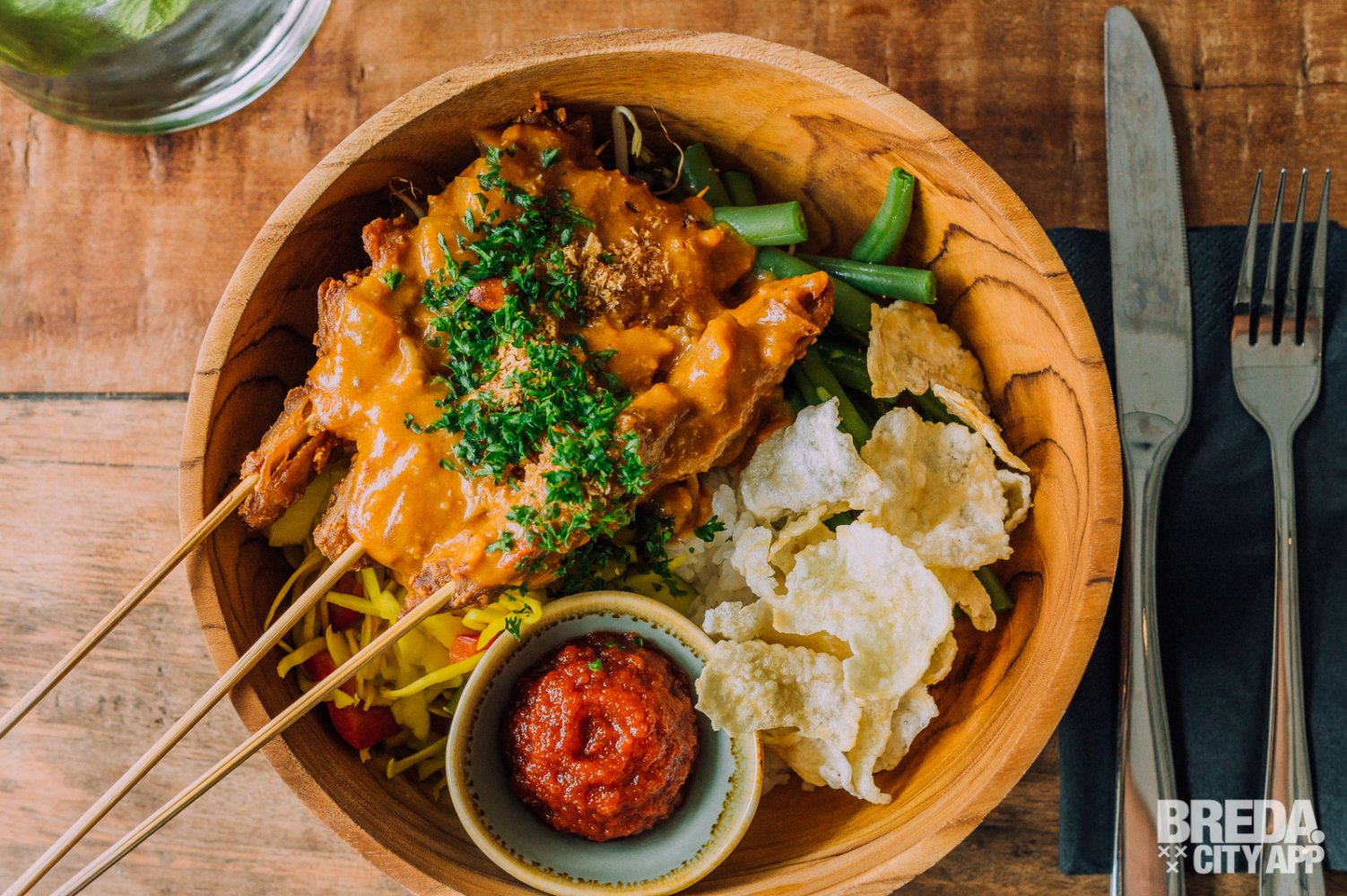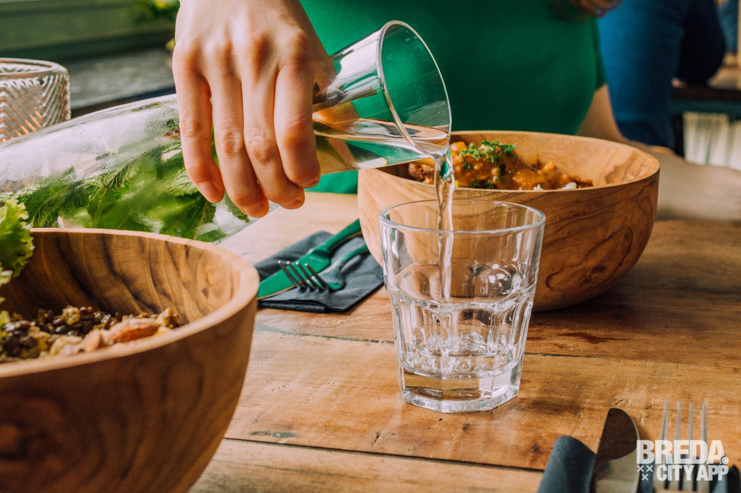 Bij binnenkomst lijkt het of ik een andere wereld binnenwandel. Wat een fijne, rustgevende sfeer. De inrichting is een mix van industrieel met Balinese invloeden, een aparte combi die ik niet eerder zo heb gezien. In het midden bevindt zich de open keuken met daaromheen verschillende zithoekjes, van lage lounge stoelen tot hoge bartafels. We worden vriendelijk begroet door de serveerster die ons laat plaatsnemen aan een tafeltje bij het raam. Vanuit hier hebben we uitzicht op de CityGarden, waar je buiten in het zonnetje lekker kunt genieten van dezelfde ontspannen sfeer.