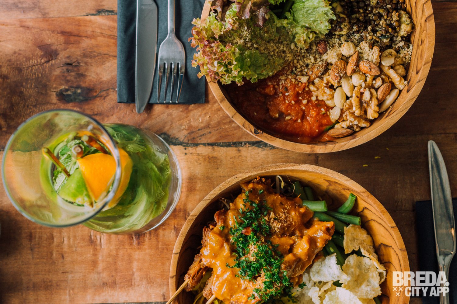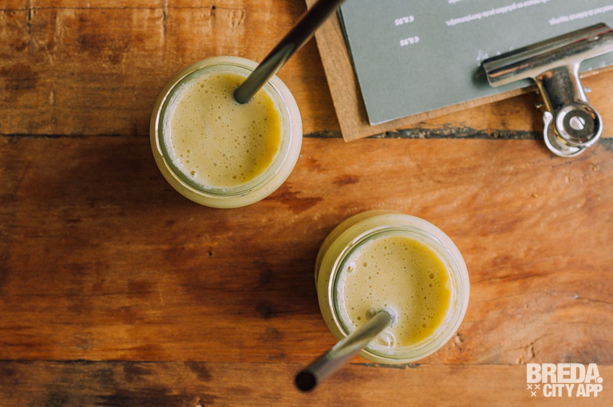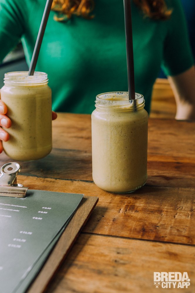 Voor we ons verlekkeren aan de menukaart vraagt de serveerster of we willen beginnen met een healthy smoothie van mango, kokos melk, soja en munt. Yes, die slaan we natuurlijk niet af! Even later zet ze twee goed gevulde, hippe glazen potjes voor ons neer. We proosten op onze gezondheid en nemen een eerste slok van de heerlijke zijdezachte vitaminebom. De smaken passen goed bij elkaar, het geheel is lekker romig en niet te zoet. Alles in balans, helemaal zen!