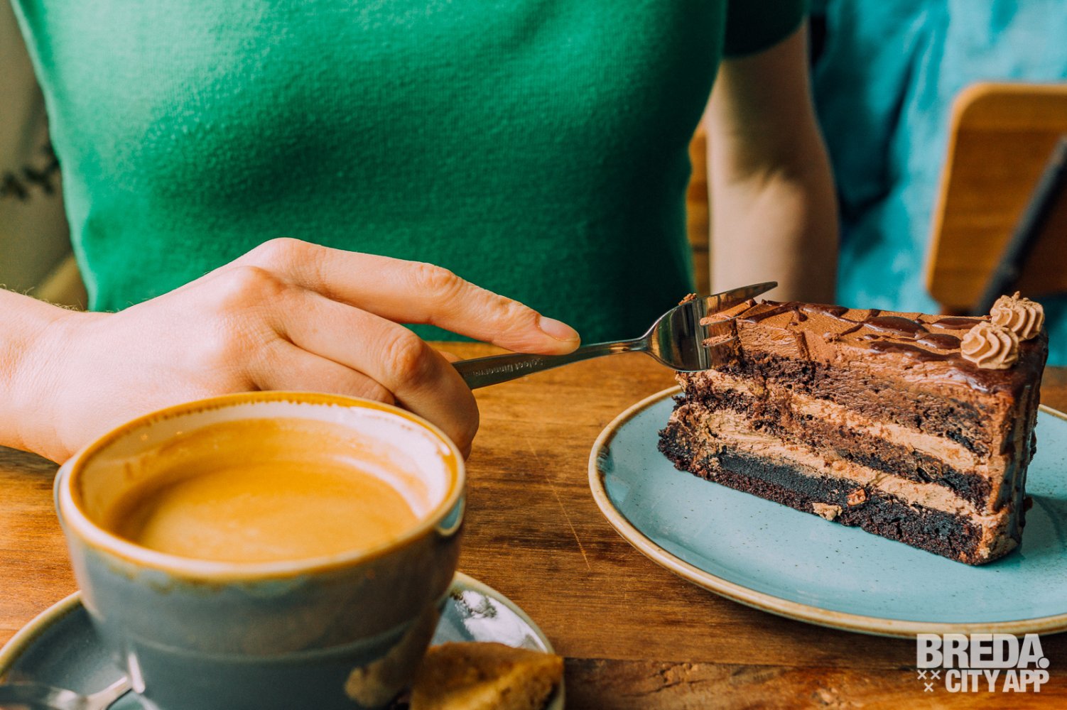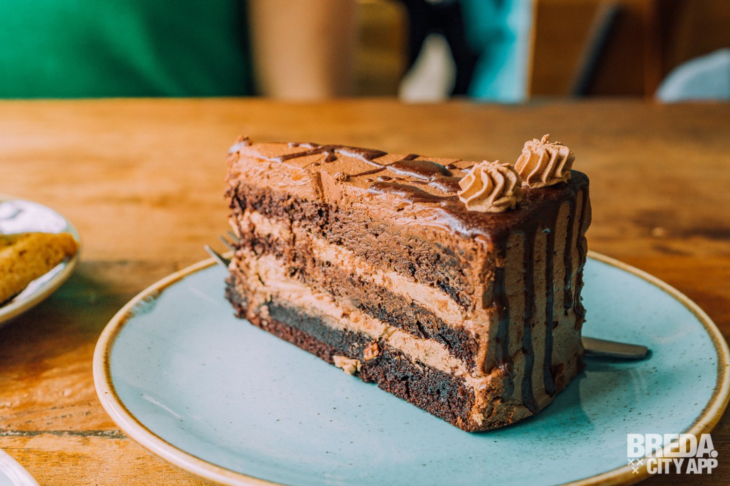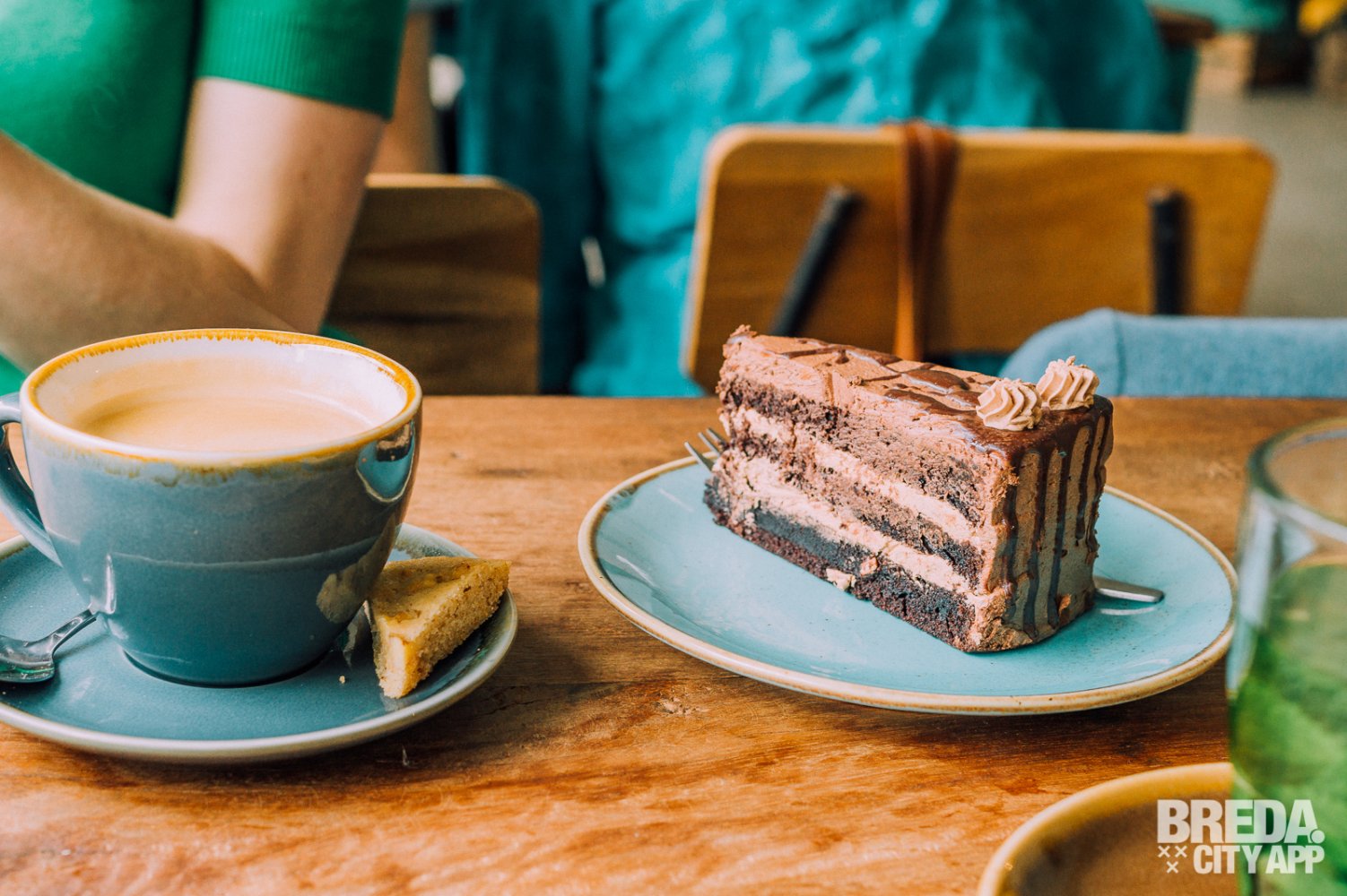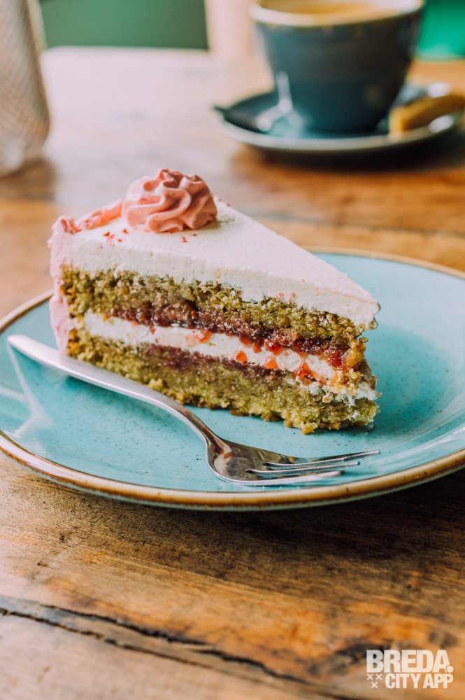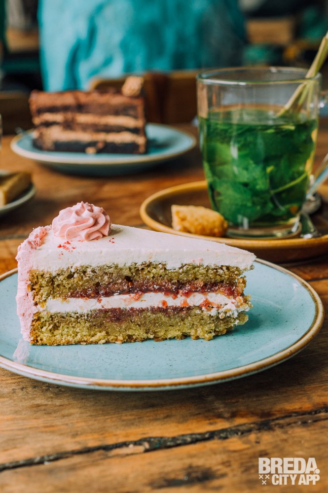 Met deze wijze woorden nog vers in ons geheugen staan we even later watertandend bij de vitrine voor het uitzoeken van ons dessert. Niet zomaar een dessert trouwens. Alle ‘sweets’ zoals ze het zelf noemen zijn organic, gemaakt zonder geraffineerde suikers en vrij van dierlijke producten. Verantwoord genieten dus! Wij gaan voor een flinke punt chocoladetaart en een macha frambozentaart.