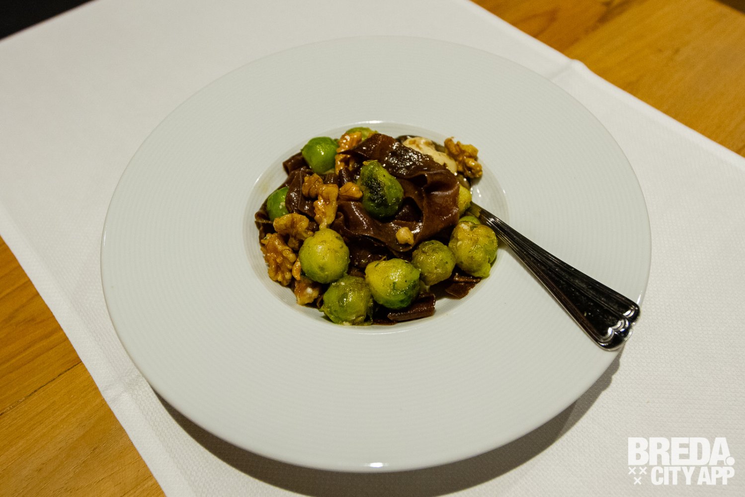 Naast deze soep krijgen we een pappardelle pasta van cacao met spruitjes, gorgonzola en walnoot. Je kan goed proeven dat er rauwe cacao is gebruikt bij het maken van deze pasta, maar samen met de zachte gorgonzola en de bite van de walnoten smaakt deze pappardelle echt hemels.