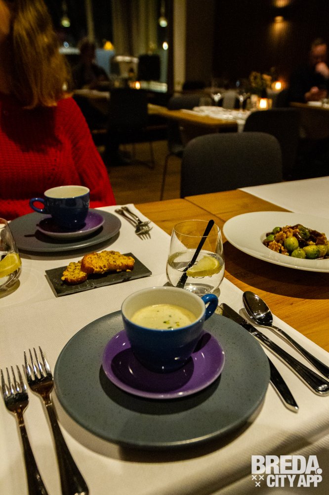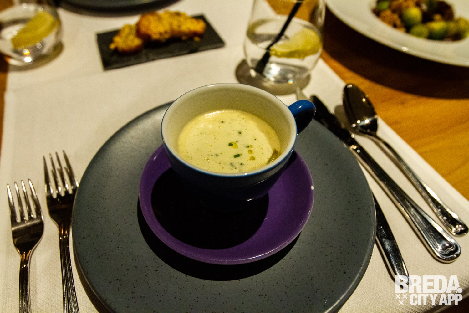 We beginnen de avond met een Italiaanse truffelsoep. Gemaakt met een crème van aardappel, wintertruffel, grana padano en het wordt geserveerd met een kaascrouton. De soep is heerlijk romig en heeft geen overheersende truffelsmaak. De combinatie met de kaas crouton maakt het helemaal af.