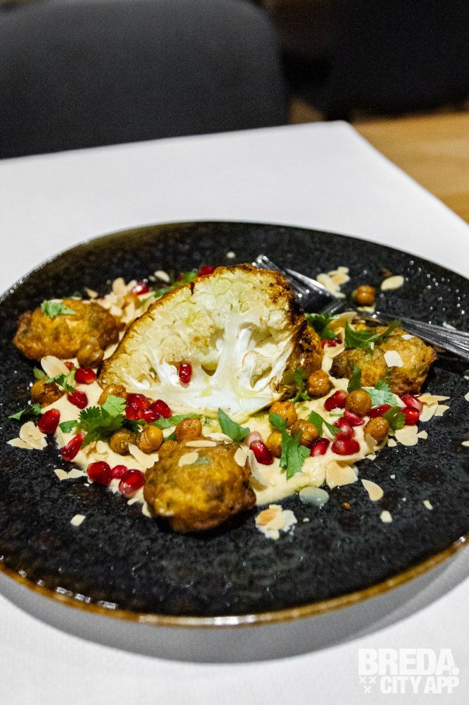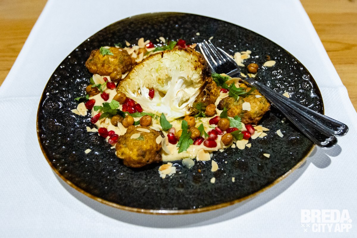Als tussengerecht wordt er een bloemkool tandoori op tafel gezet. Enorm smakelijk opgemaakt, waar de kleuren een grote rol in spelen. Deze tandoori wordt geserveerd met een romige hummus, frisse granaatappelpitjes, scherpe koriander en de lekkerste maiskoekjes die we ooit gegeten hebben. We hebben na dit gerecht zelfs het recept gevraagd aan de chef. Wat zo verassend was aan dit gerecht was dat ook de hummus warm geserveerd werd en dat dit eigenlijk perfect bij het gerecht past.