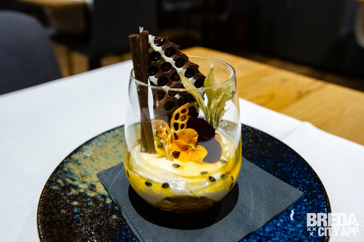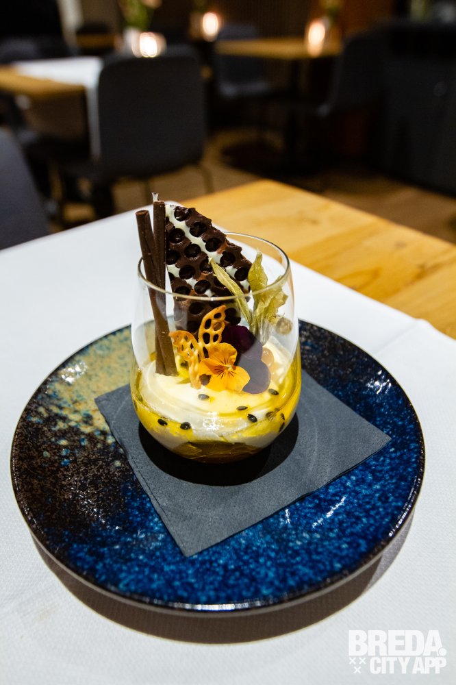 Als afsluiter van deze heerlijke vegetarische avond krijgen we een Italiaanse tiramisu, ook om te delen. Geen gewone tiramisu, maar eentje van passievrucht. Het bevat een witte chocolademousse en een passievruchten coulis. Deze tiramisu is anders dan anders en heeft een zomers tintje. De bittere pure chocolade die erbij geserveerd wordt, geeft de perfecte tegenhanger voor de zoete passievrucht. Je kunt de amaretti koekjes proeven, maar het gehele dessert is niet te zwaar. Een mooie afsluiter van deze avond.