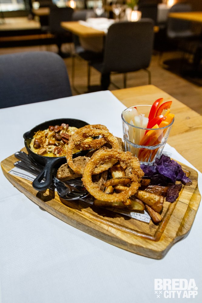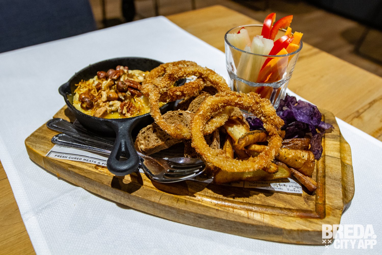 Het tweede hoofdgerecht wat hierna op tafel wordt gezet is het pannetje van camembert. Een perfect gerecht om midden op de tafel te zetten en samen te delen, als je daarvan houdt. De camembert is in de oven gegrild en daarna getopped met honing en verschillende noten. We zien het als een mini-kaasfondue, want naast de camembert worden gegrilde pastinaak en aardappel, gefrituurde uienringen en groentechips, gebakken brood en rauwe groentes geserveerd, welke we in de warme camembert konden dopen.