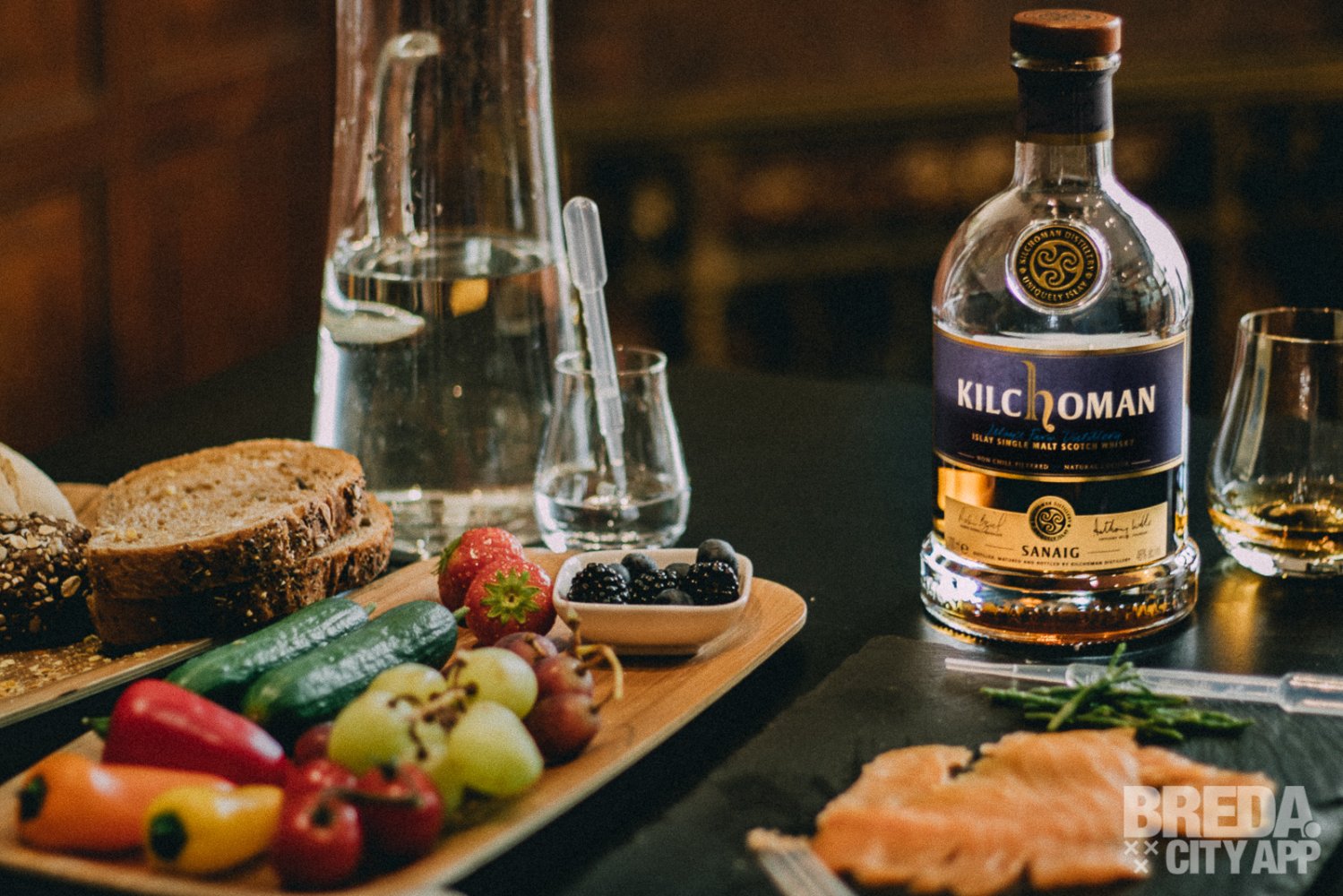 Terwijl wij nog van de Glenkinchi aan het genieten zijn, wordt de lunch geserveerd. We hebben een ruime keus uit verschillende broodjes, vers fruit, groente en gerookte zalm die geserveerd wordt met een pipet met daarin… jawel, peated oftwel gerookte whisky! Het advies is om de whisky subtiel over de zalm heen te druppelen vlak voordat je hem eet. Wat een top idee! Ook krijgen we een kaasplankje met 4 soorten kazen, allemaal gerijpt op of met een toevoeging van een whisky. Het absolute pronkstuk, de Occelli Malto Orzo, is een stevige Italiaanse oude kaas met een korst van het whisky mout.