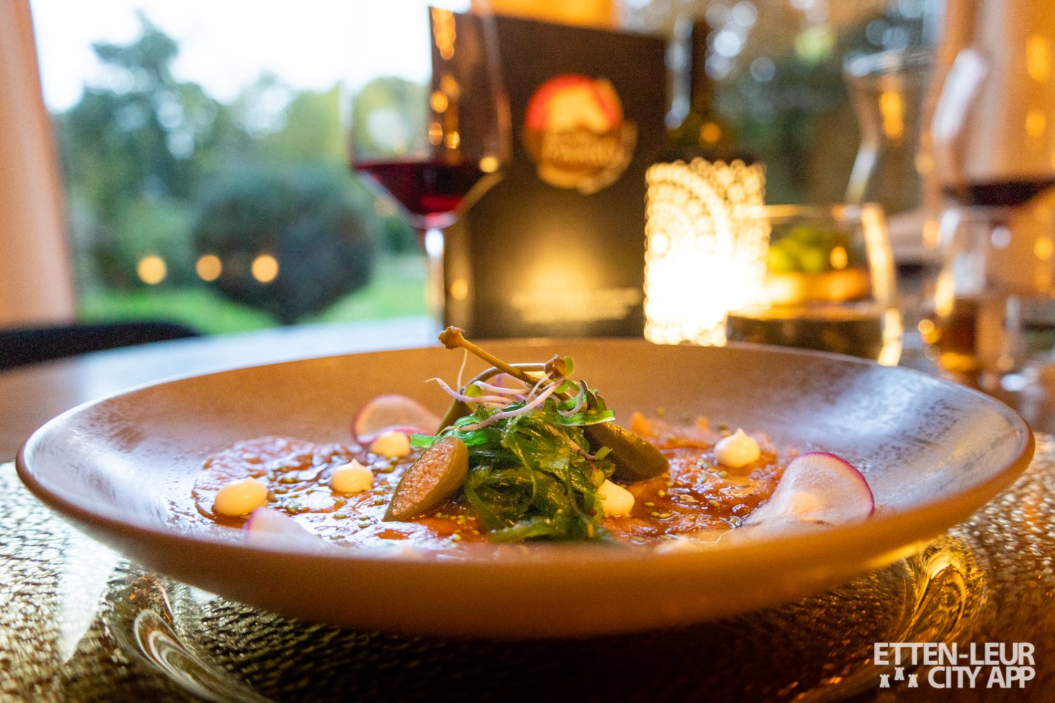 We kozen voor de zalm carpaccio met limoen mayonaise en rode ui met daarbij een steak tartaar met zwarte knoflook, cornichons en sjalotjes.