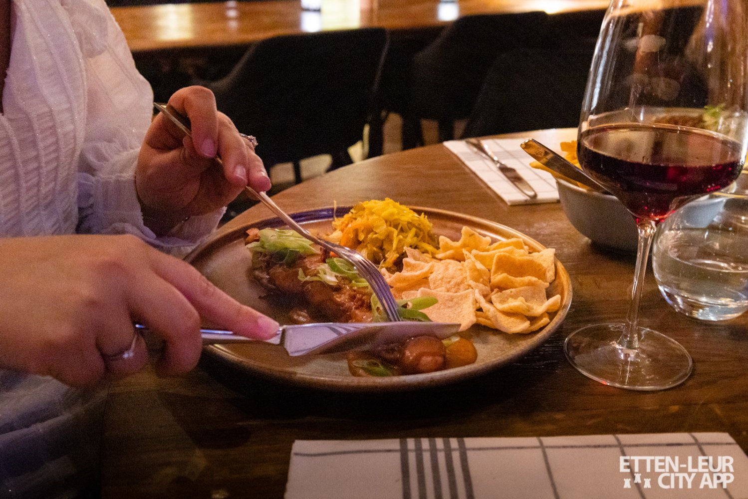 Naast de entrecote kozen we voor een saté van kippendij met pindasaus, cassave, atjar en krokante ui. De zachte kippendij was goed gebakken en de atjar was een frisse afwisseling bij het gerecht. Bij het hoofdgerecht kregen we ook een schaaltje friet met mayonaise om te delen.
