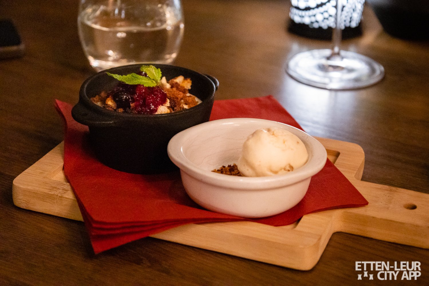 Na de eerste twee gangen zaten we al aardig vol en de bediening vroeg vriendelijk of wij even wilde wachten met het dessert. In deze korte pauze konden wij genieten van het mooie uitzicht van het park. Het dessert werd geserveerd en wij zagen een heerlijke cheesecake limoen met een bolletje oreo ijs.