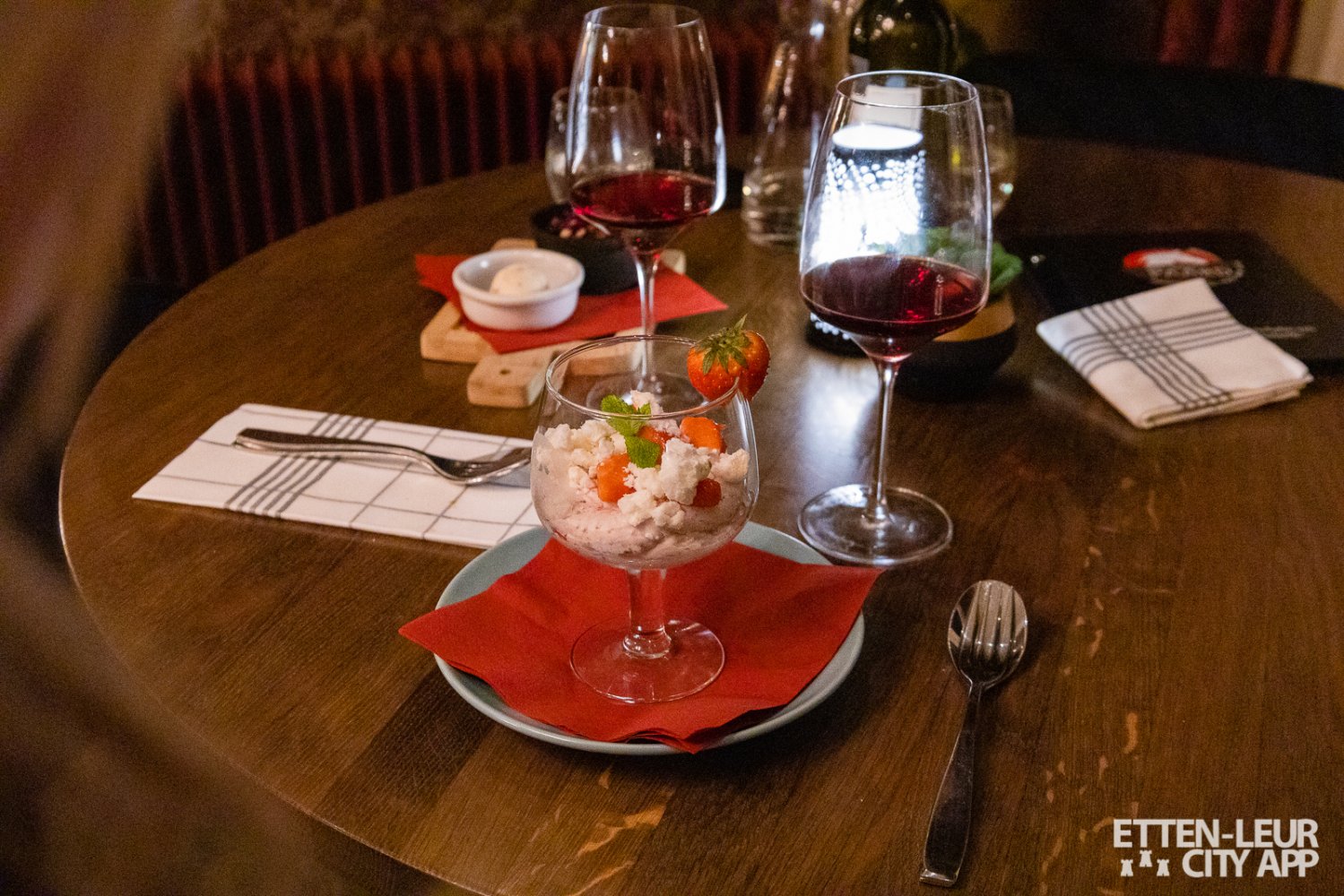 Vanavond gaan we van de nieuwe kaart proeven in drie gangen. We ontvingen de kaart en namen een kijkje tussen de wijnen. De ruime keuze maakte het ons moeilijk maar met de hulp van de fijne bediening kregen we een mooie rode wijn aangeboden. De keuze viel op de Blauburgunder Pinot Nero, een fruitige wijn uit Italië.