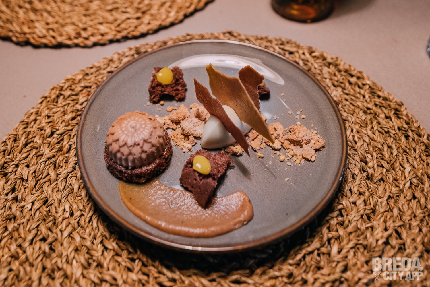 We sluiten af met de friandise, wat bij dit menu een prachtig mini-dessert is voor 2 personen. Het bestaat uit smaken van banaan, karamel, chocolade en yuzu. Ondanks dat we al redelijk verzadigd zijn na de voorgaande 4 gangen, kunnen we dit niet laten staan. Een prachtige afsluiter!