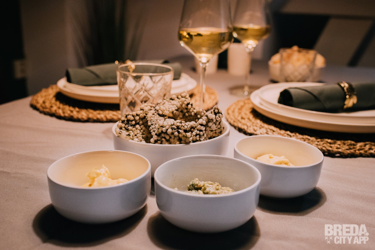 Vanavond proeven we het complete menu en om het af te maken ook nog een dessert. Het complete menu bestaat uit Zuydkroepoek, brood, een voorgerecht, een tussengerecht een hoofdgerecht én friandises. Optioneel kan je hier nog een dessert aan toevoegen. We starten ons diner met de Zuydkroepoek met daarbij pompoendip. Heerlijk!