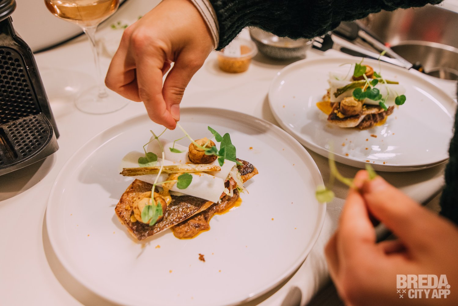 We besluiten om een korte pauze in te lassen, voordat we doorgaan naar het hoofdgerecht. Aan tafel lezen we alvast de beschrijving door voor de volgende gang: Dorade & Rendang. De instructies van de chef zijn super duidelijk, waardoor zowel de bereiding als het opmaken van de borden goed lukt. Leuk om zelf nog een laatste hand te leggen aan de gerechten!