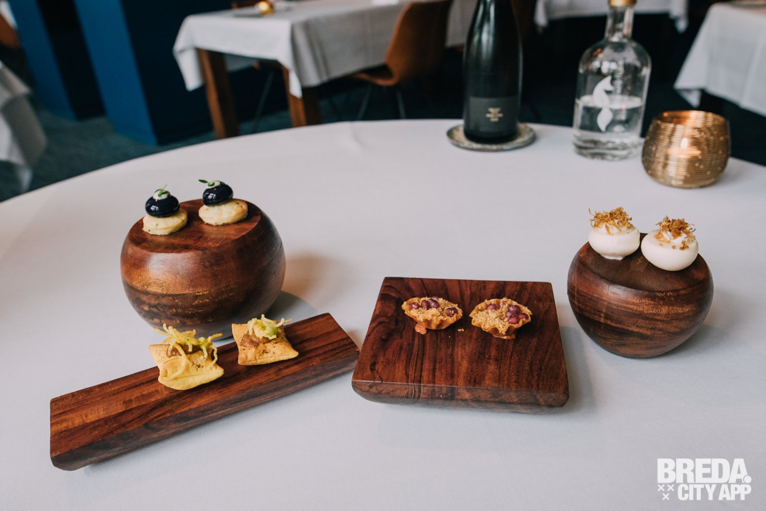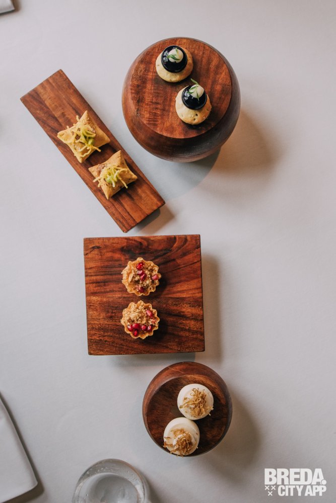 We starten onze lazy sunday met (van links naar rechts) een pita met baba ganoush en een tahini crème, een brood kussentje gevuld met soto met een crème van ui en bladselderij, tartelette gevuld met Mouhamarra afgemaakt met granaatappelpitjes en een zuurkool merengue met wat krokante zuurkool erop.