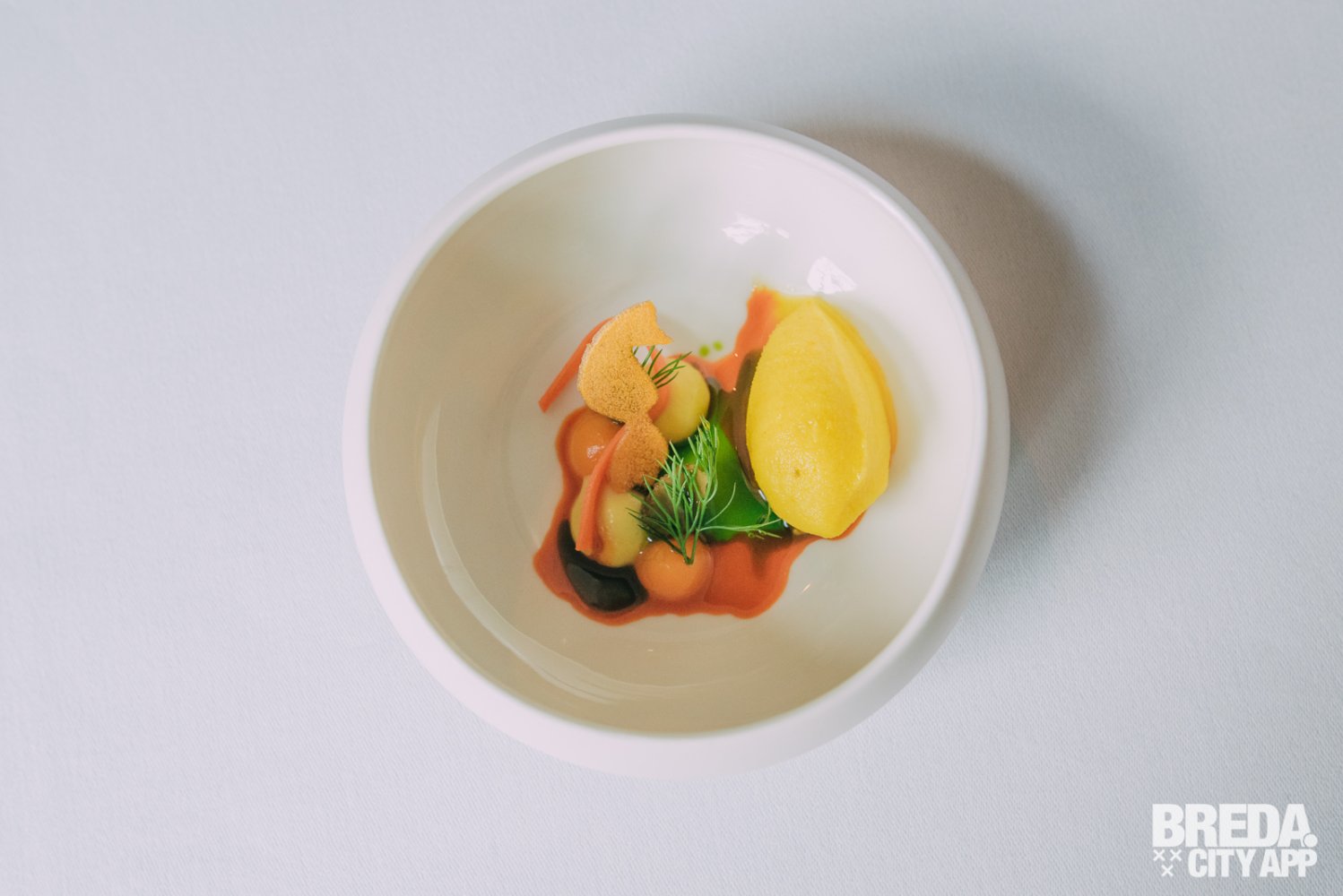 De opa van de chef is ooit begonnen met het bedrijf 'Uijttewaal'. Dit was een conservenfabriek die ook piccalilly maakte. Vandaar dat je de piccalilly altijd ziet terugkomen in bij Uijttewaal in de amuse. Een sorbet van piccalilly met daarnaast dezelfde ingrediënten op een andere manier bereid, afgemaakt met een olie van dille en een olie van wortel. Een ontzettend frisse amuse die ons voorbereidt op de komende gangen en een plaatje is om naar te kijken met deze kleur combinatie!