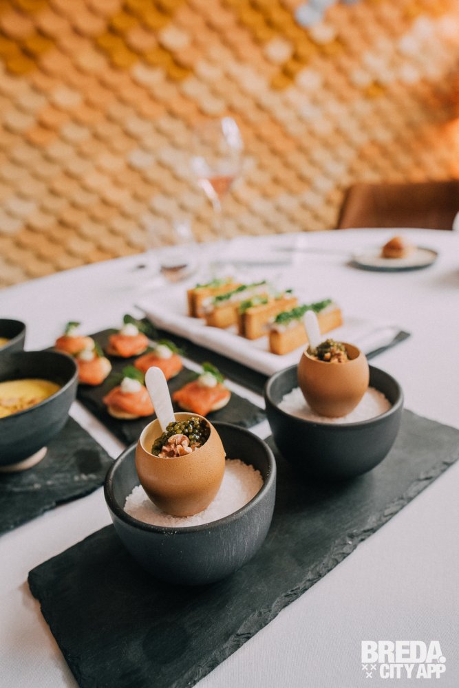 Zie hier een brioche met gerookte paling, crème fraîche en bieslook, toast cannibal, heel klassiek met steak tartaar en lekker pikant! Een klassieke krabcocktail met een krokantje van Wakamé en Blini's met crème fraîche en huis gerookte zalm.