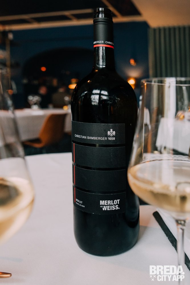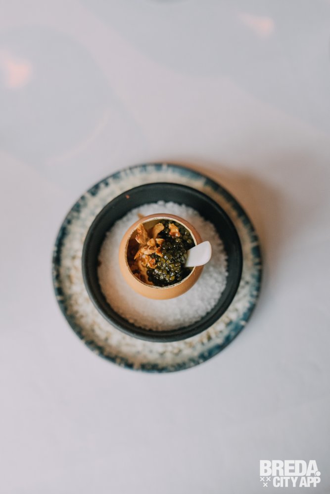 Er wordt een heerlijk fris glas Merlot ingeschonken. Een witte wijn gemaakt in Duitsland, en je ziet het goed... een witte wijn. Deze wijn geeft rood fruit aroma's weg wat je op het eerste oog niet ziet, gemaakt door Christiaan Blanbergen. Een lichte prikkeling op de tong en een enorm frisse smaak, de merlot geeft fruitige aroma’s en wij zijn verrast door deze Merlot. Onze nieuwe favoriet en echt het proberen waard als je bij Uijttewaal gaat eten! Hiernaast een kijkje in het eitje met Oscietra kaviaar. Een eitje met Chawanmushi, dashi en ei, een Russische Oscietra kaviaar, deze kaviaar is nootachtig en daarop is nog het accent gelegd door hem met walnoot te garneren.