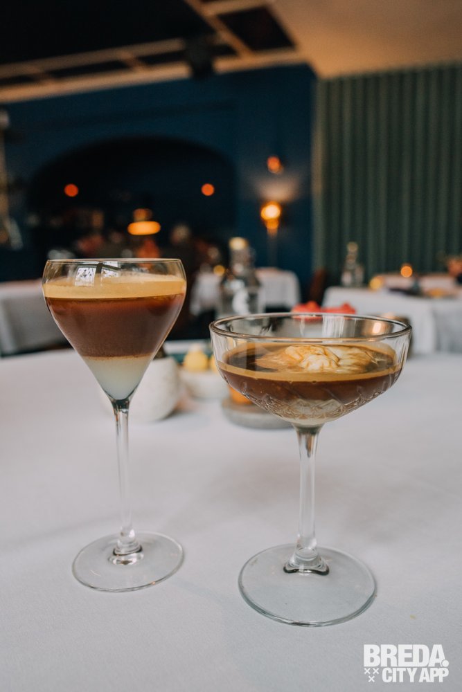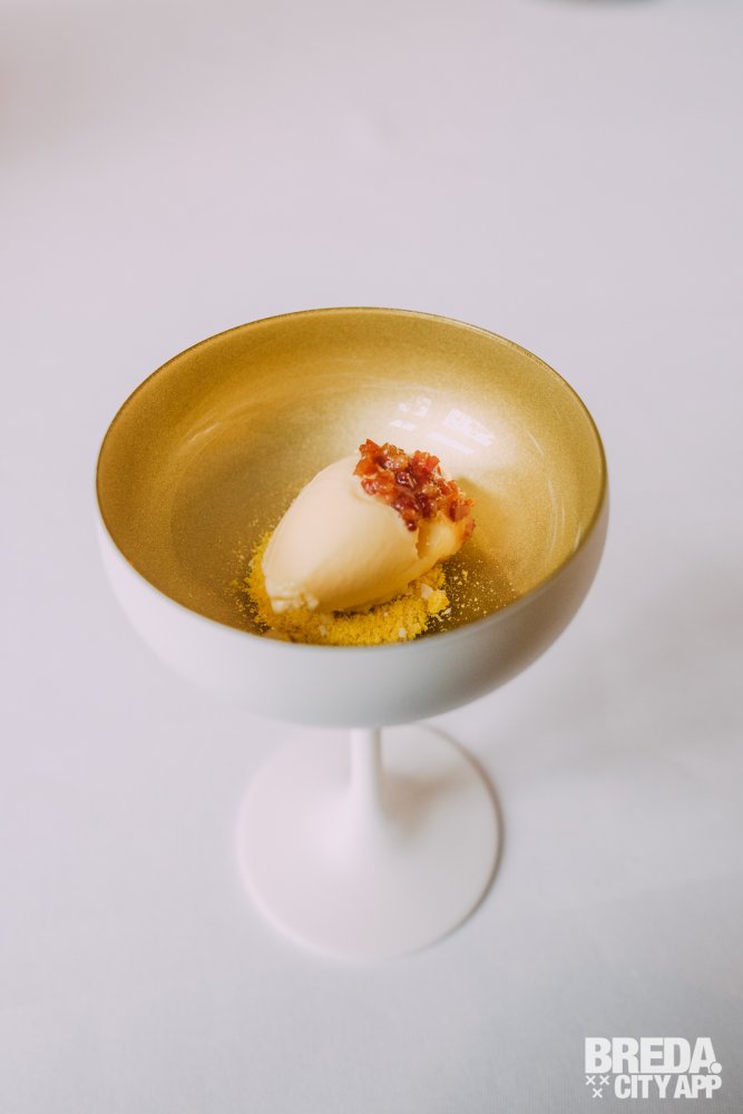 We gaan door met een dessert amuse, een crème van mais en limoen, een crumble van popcorn, limoen en spons cake met ijs van gezouten popcorn met daaroverheen in ahornsiroop gekarameliseerd spek. Een heerlijke combinatie van zoet met gezouten popcorn en spek. Na de amuse verschijnen twee speciale koffies, Lisa vertelt ons over de nieuwe koffiekaart en natuurlijk proberen wij deze graag uit. Een dubbele espresso met vanille roomijs, een “Affogato” en een Caffè leccese: deze is afkomstig uit Leche, hier serveren ze een ijskoffie met onderin amandel siroop en daarbij een dubbele espresso. Door alle verschillende smaken en gangen voelt het alsof we al uren gezellig zitten en dit blijkt ook te zijn! Het is half 4 en deze lazy sunday kun je dus zo lazy maken dat er een hele zondagmiddag mee gevuld wordt.