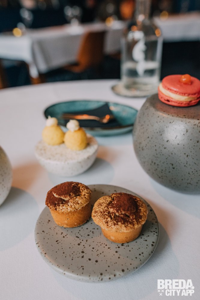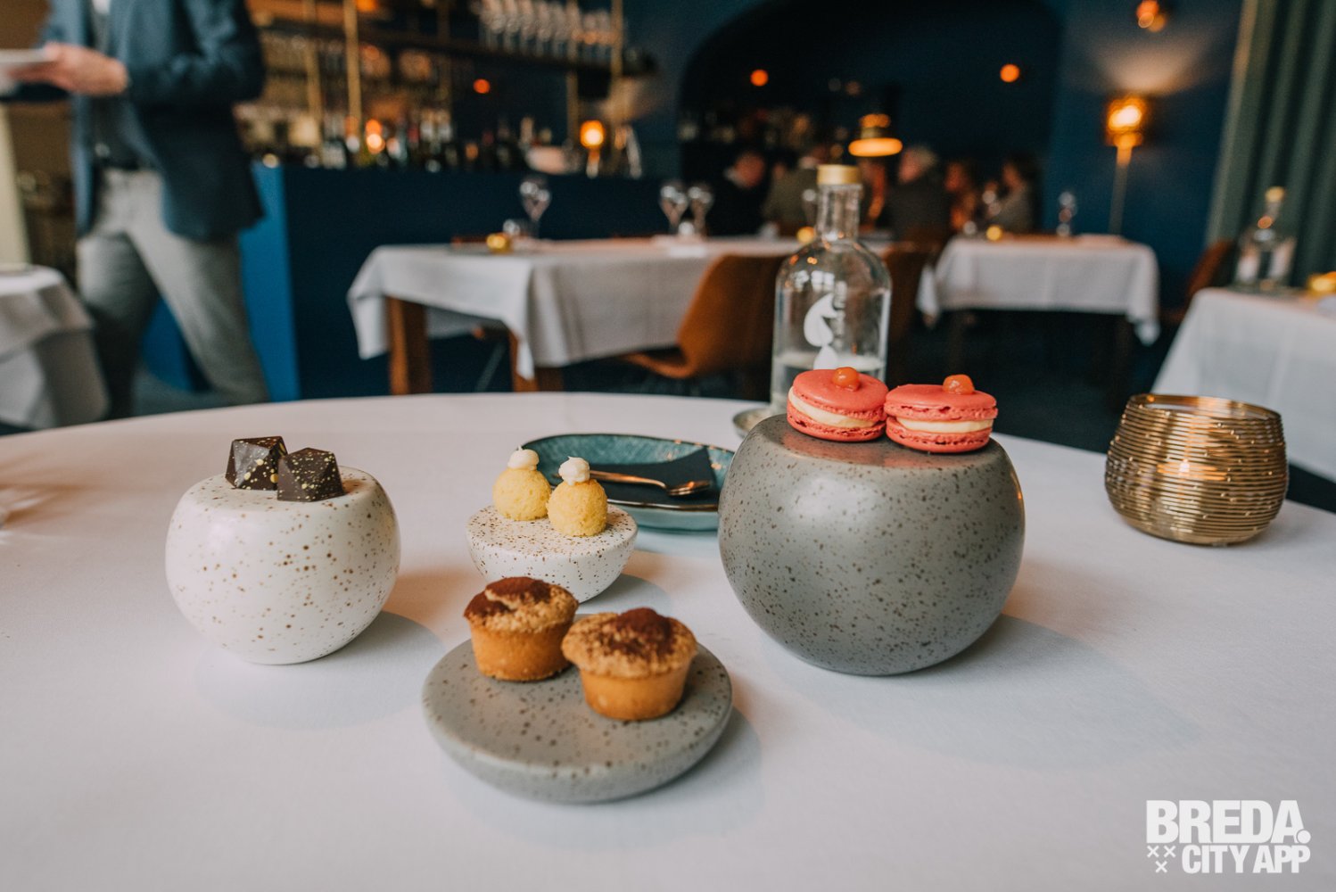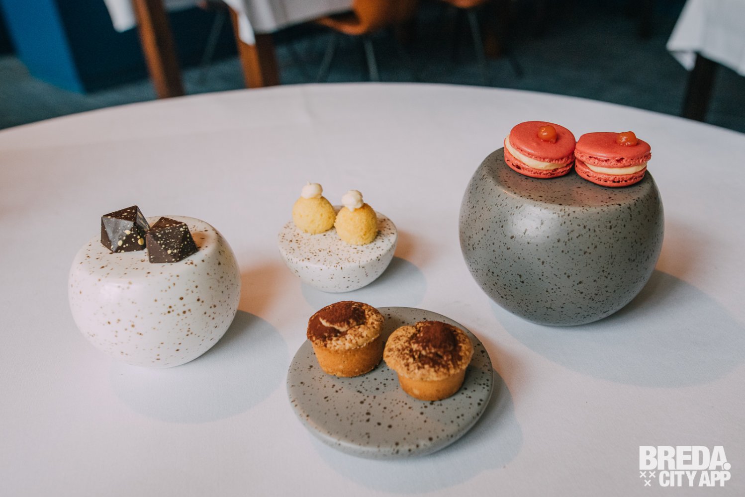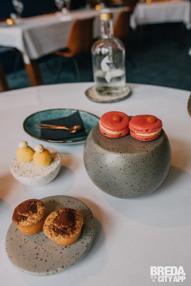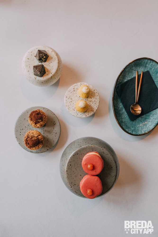 Hierna wordt de tafel vol gezet met heerlijke friandises; een huisgemaakte bonbon met gekarameliseerde witte chocolade, bananenbrood cake met witte chocolade en pastinaak, een tiramisu merengue en last but not least een bloedsinaasappel macaron! We kunnen geen favoriet kiezen uit deze selectie van prachtig gepresenteerde friandises. We sluiten deze gezellige Lazy Sunday lunch af en kijken terug op een ontzettend goed verzorgde middag!
