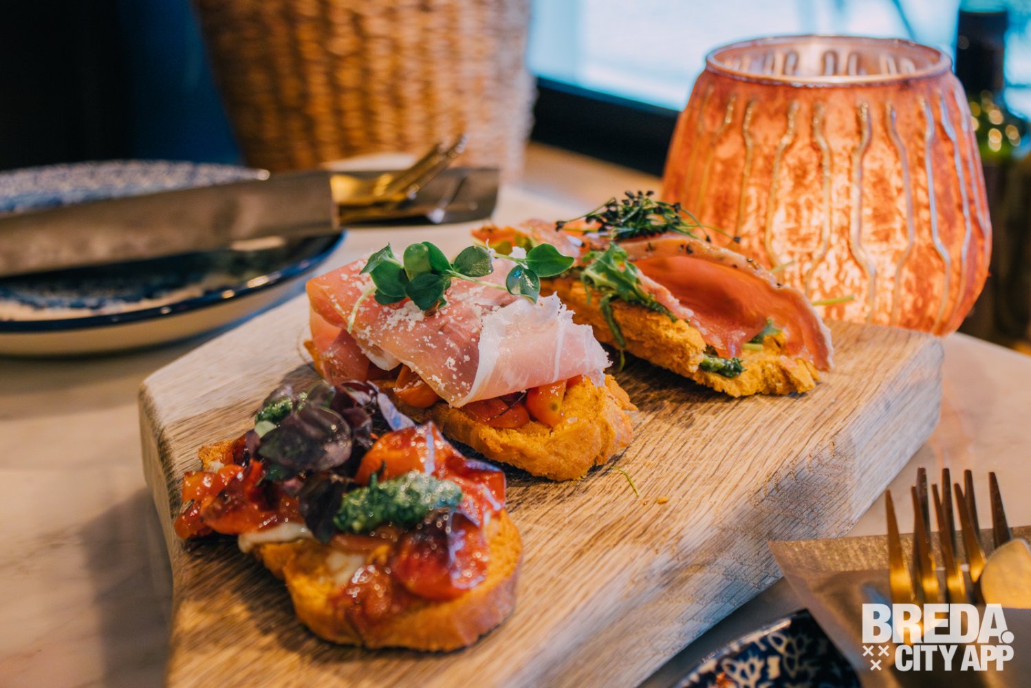 Al snel krijgen we drie soorten bruschetta geserveerd op een houten plank. De knapperige toast met verrassende toppings varieert van smaak. We genieten van de bruschetta met buffelmozzarella en prosciutto, beide met gekonfijte tomaat, en de tonijn met pesto. Ondertussen drinken we nog een lekkere Perron-pilsener en bladeren we door de "krant" van deze Italiaanse Trattoria. Het menu en de producten uit hun winkeltje staan erin, leuk om door te lezen.