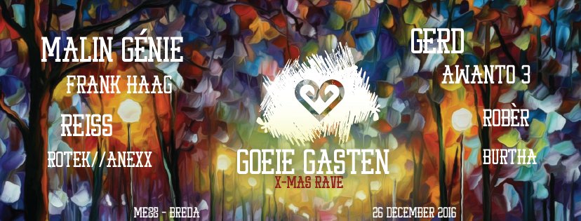 Zo staan Gerd, Awanto 3 én Malin Genie in de grote zaal van Mezz. Niet de minste namen! Voor de kleine zaal halen de Goeie Gasten de Amsterdamse minimal-house helden Frank Haag en Reiss naar Breda. Als support acts draaien Goeie Gasten residents Robèr, Rotek//Anexx en gast-dj Burtha. Je ziet, met zo’n menukaart valt wat te kiezen op tweede kerstdag.