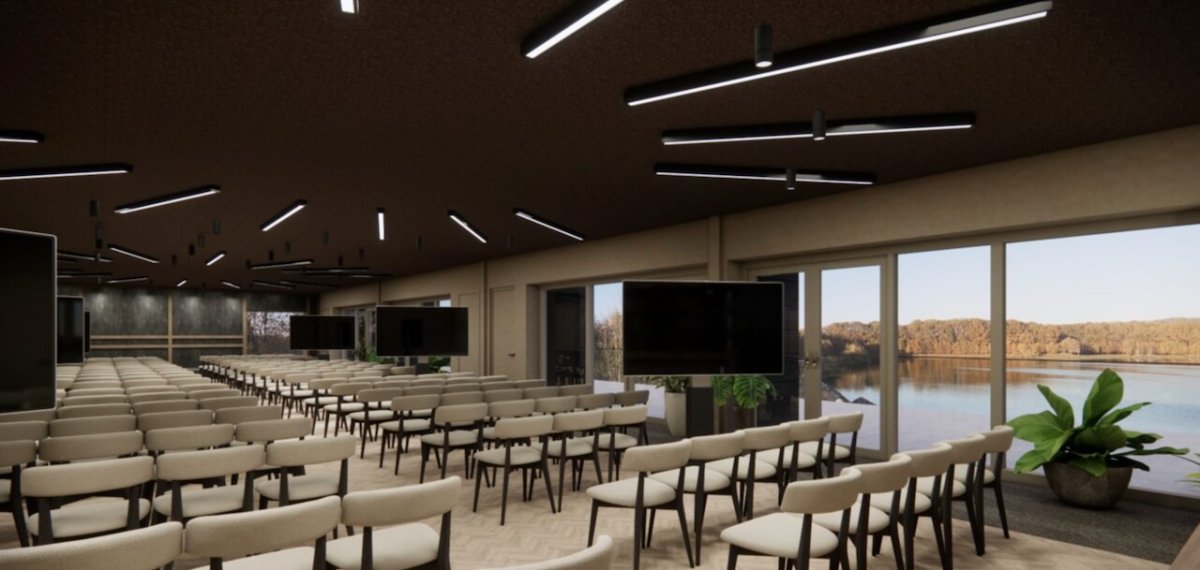 De bovenverdieping bestaat straks uit vier afzonderlijke zalen die zowel apart als gecombineerd gebruikt kunnen worden. Daardoor kan de locatie eenvoudiger inspelen op zowel kleinere vergaderingen als grotere bijeenkomsten. Het dakterras vormt een extra troef: een sfeervolle plek voor recepties, borrels of pauzemomenten met een uniek uitzicht over het meer.