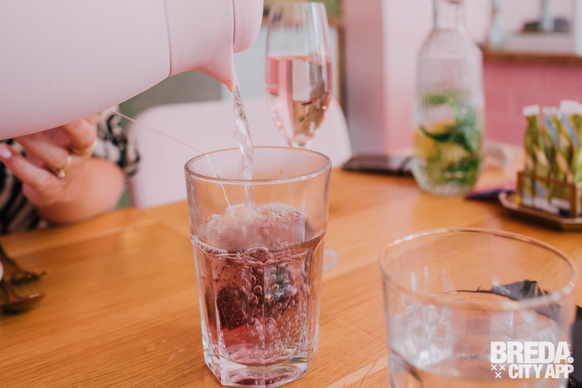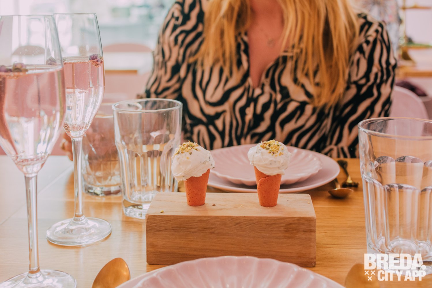 Zodra we plaats hebben genomen aan de charmant gedekte tafel starten we met een Mocktail amuse, heerlijk zoet en roze van kleur! Deze mocktail past perfect bij deze locatie, The Cake Room staat bekend om de creatieve en kleurrijke inrichting en lekkernijen, we kijken onze ogen uit!
