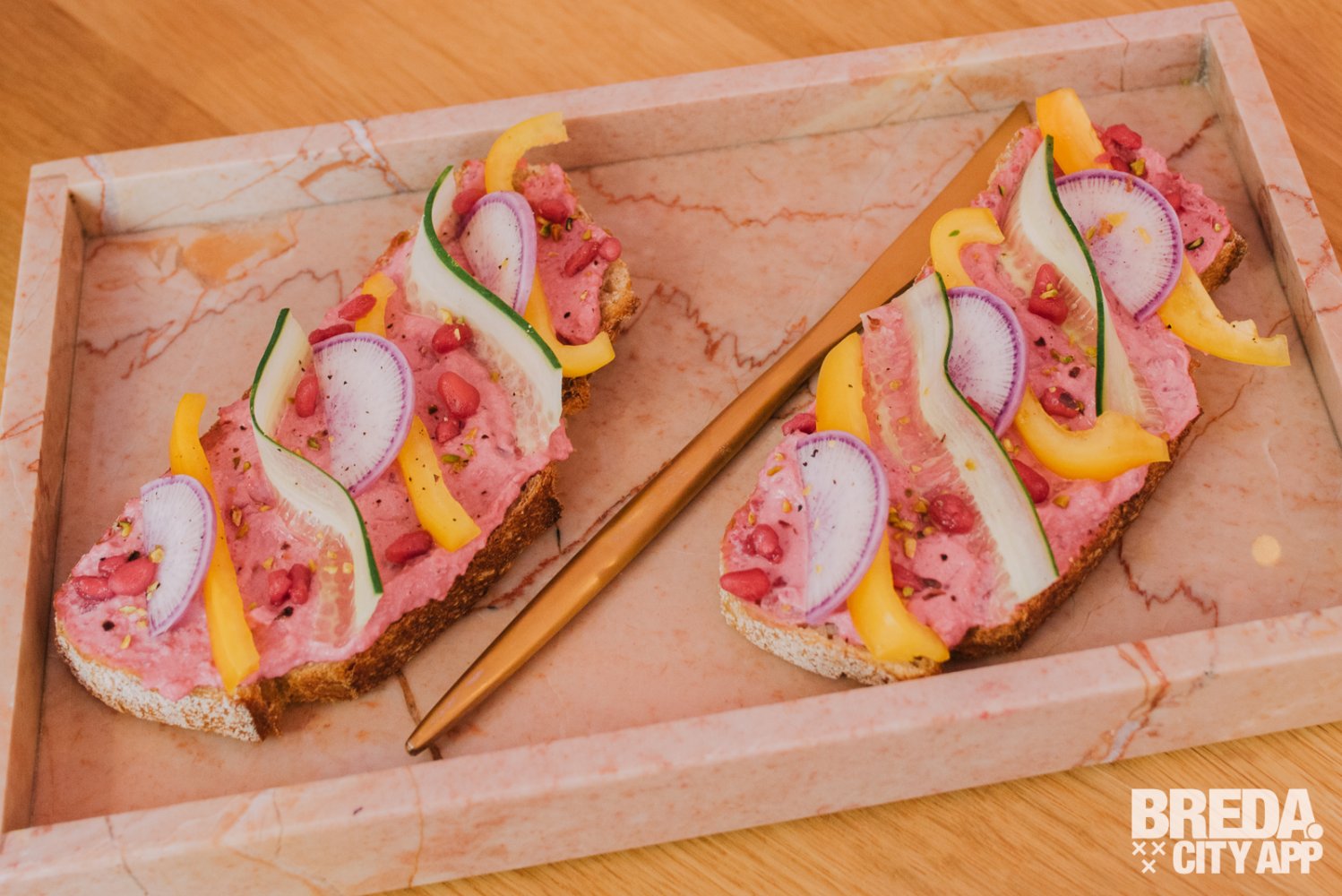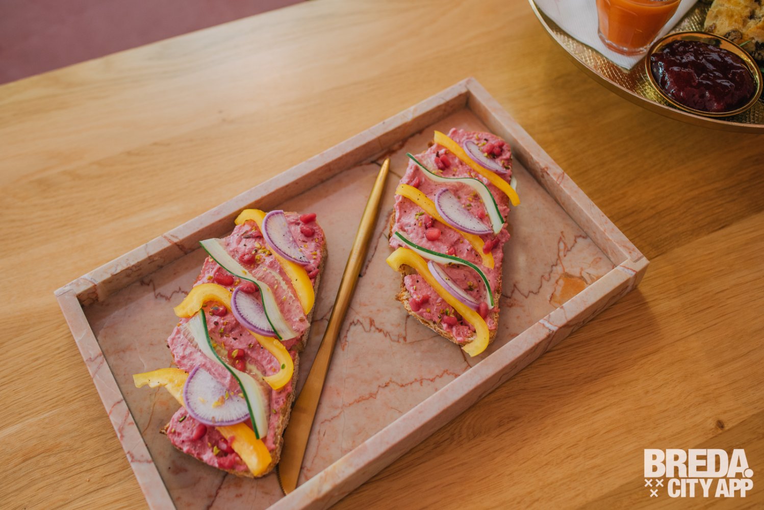 Natuurlijk een side dish in de kleur... roze! Desembrood met een spread van rode biet, dit maakt de spread roze waardoor dit wederom prachtig past in de roze Vibe van The Cakeroom. Dit broodje smaakt ontzettend fris en heerlijk voor tussendoor, hierna gaan wij weer door aan de etagère en genieten van al het zoets.