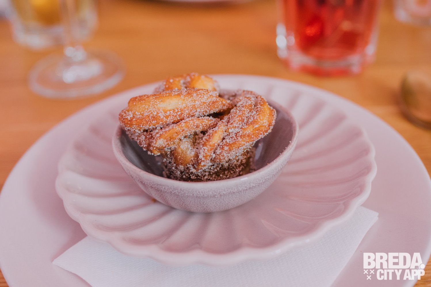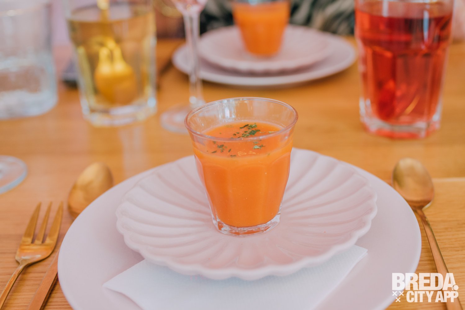 Allereerst een Gazpacho, dit is een koude soep van tomaat met munt. Een hartige start voor al het zoet wat nog komen gaat. Wij hebben er zin in!