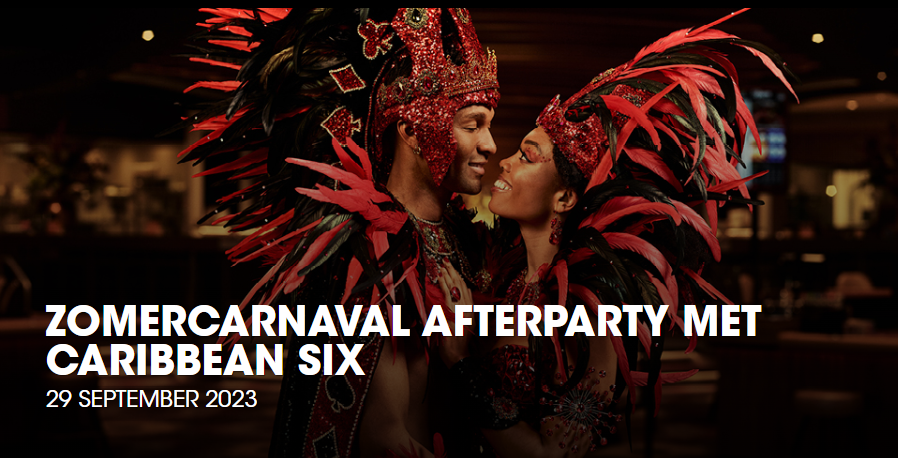 Geniet van een avond in tropische sferen. Het Zomercarnaval, gesponsord door Holland Casino, liet de Rotterdamse straten in juli exploderen. Op vrijdagavond 29 september doen ze dit feest nog eens over tijdens de Zomercarnaval Afterparty van 21.00 tot 01.00 uur. Zorg dat je om 21.00 uur aanwezig bent, want dan start het optreden van de populaire muziekformatie Caribbean Six.