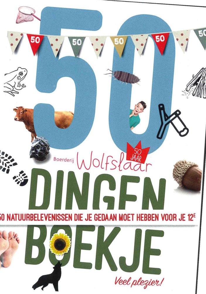 Onlangs heeft Boerderij Wolfslaar het "50 dingenboekje" gelanceerd. Dit is een gratis en online te downloaden boek waarin 50 dingen staan die een kind voor zijn of haar 12de levensjaar gedaan zou moeten hebben, gebaseerd op natuurbelevenissen.