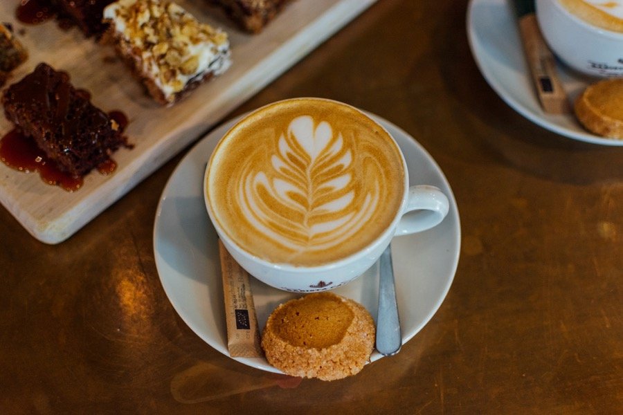 We lopen binnen bij dit sfeervolle zaakje aan de Grote Markt en worden direct vriendelijk verwelkomt door het personeel achter de counter. Geen zelfbediening, gewoon een fijn plaatje uitzoeken en op je wenken bediend worden; heerlijk. We bestellen een cappuccino op basis van kokosmelk, geheel vrij van lactose.