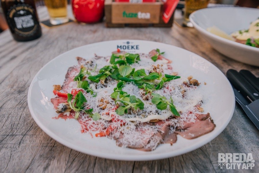 Terwijl we genieten van het zonnetje komt de bediening vragen wat we willen eten. We laten ons vanavond graag verrassen. Niet veel later komen er twee prachtig opgemaakte borden onze kant op. We starten met een rosbief van entrecote. De rosbief is dun gesneden en zeer goed van smaak. Deze is afgetopt met mosterdmayonaise, Parmezaanse kaas, walnoten en gemarineerde paddenstoelen. Een perfecte combinatie en lekker licht op de maag om mee te starten.