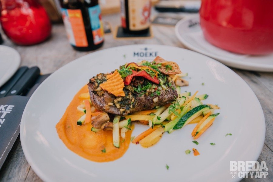 Vervolgens gaan we verder met de runderbavette. Deze is geserveerd met verse chimichurri op basis van verse kruiden en knoflook en knapperige groenten waaronder courgette, paprika en champignons. De bavette is perfect gebakken en daardoor lekker mals. De chimichurri maakt dit gerecht helemaal af. Als bijgerecht krijgen we heerlijk vers gesneden dikke frieten geserveerd. Moeke weet als geen ander hoe de vork in de steel steekt en dat is wel weer gebleken!