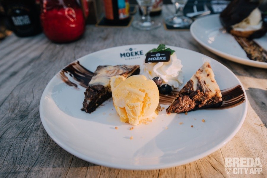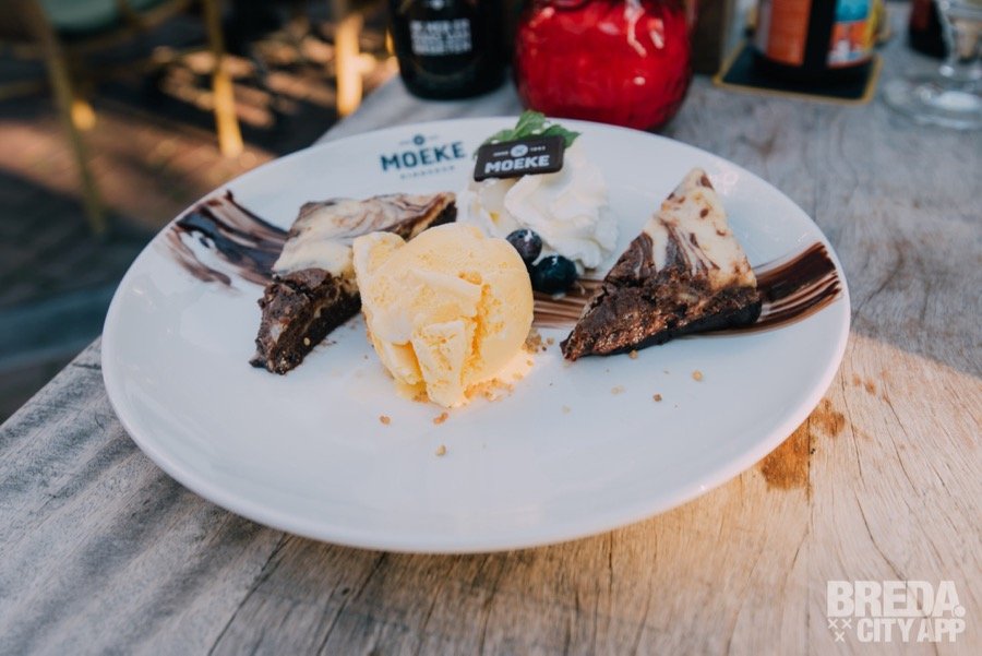 Daarnaast krijgen we het taartje van Izan. Leuk om te weten is dat dit taartje vernoemd is naar de zoon van één van Moeke's chefs. Het taartje van Izan bestaat uit twee kleuren brownie met slagroom en bananenijs. De brownies zijn lekker sticky en het bananenijs past er perfect bij. Ook krijgen we twee goede kopjes koffie geserveerd wat het dessert helemaal afmaakt.