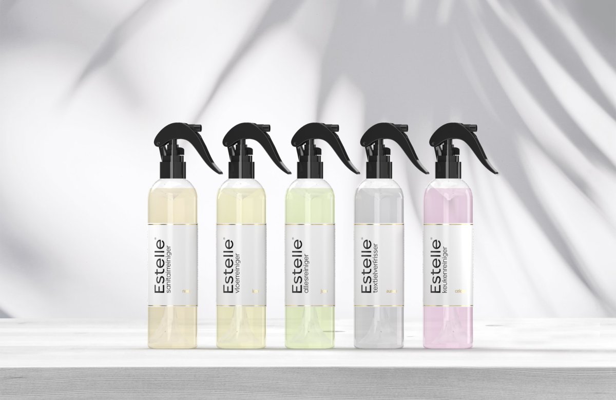 Met de nieuwe producten van Estelle wordt schoonmaken echt een feestje. Het assortiment bestaat uit vijf basisproducten; sanitairreiniger, vloerreiniger, allesreiniger, textielverfrisser en keukenreiniger. En voor al deze producten heb je ook nog eens keuze uit vijf lekkere geuren én vijf mooie (pastel)kleuren.