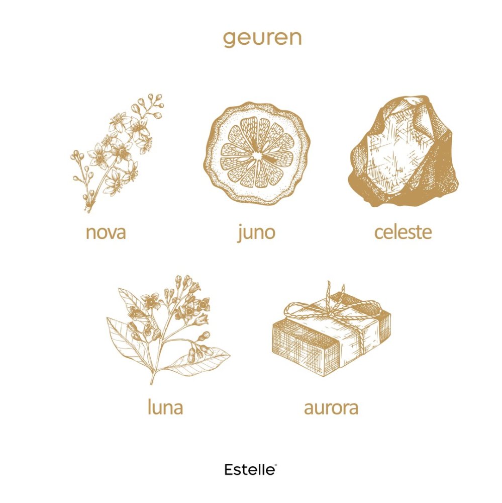 De geuren en kleuren zijn geïnspireerd door de sterren. De juno geur creëert een heerlijk zomers gevoel in huis door de frisse citrus geur van de Aziatische yuzuvrucht en de verassende twist van houtachtig bergamot. Celeste is een luxe geur van poederig jasmijn met kruidige tonen van hout en amber. En de luna geur is afkomstig van de Nieuw-Zeelandse lemonwood tree en heeft daarmee een heerlijk fruitige citrusgeur. Alle geuren zijn met alle kleuren te combineren!