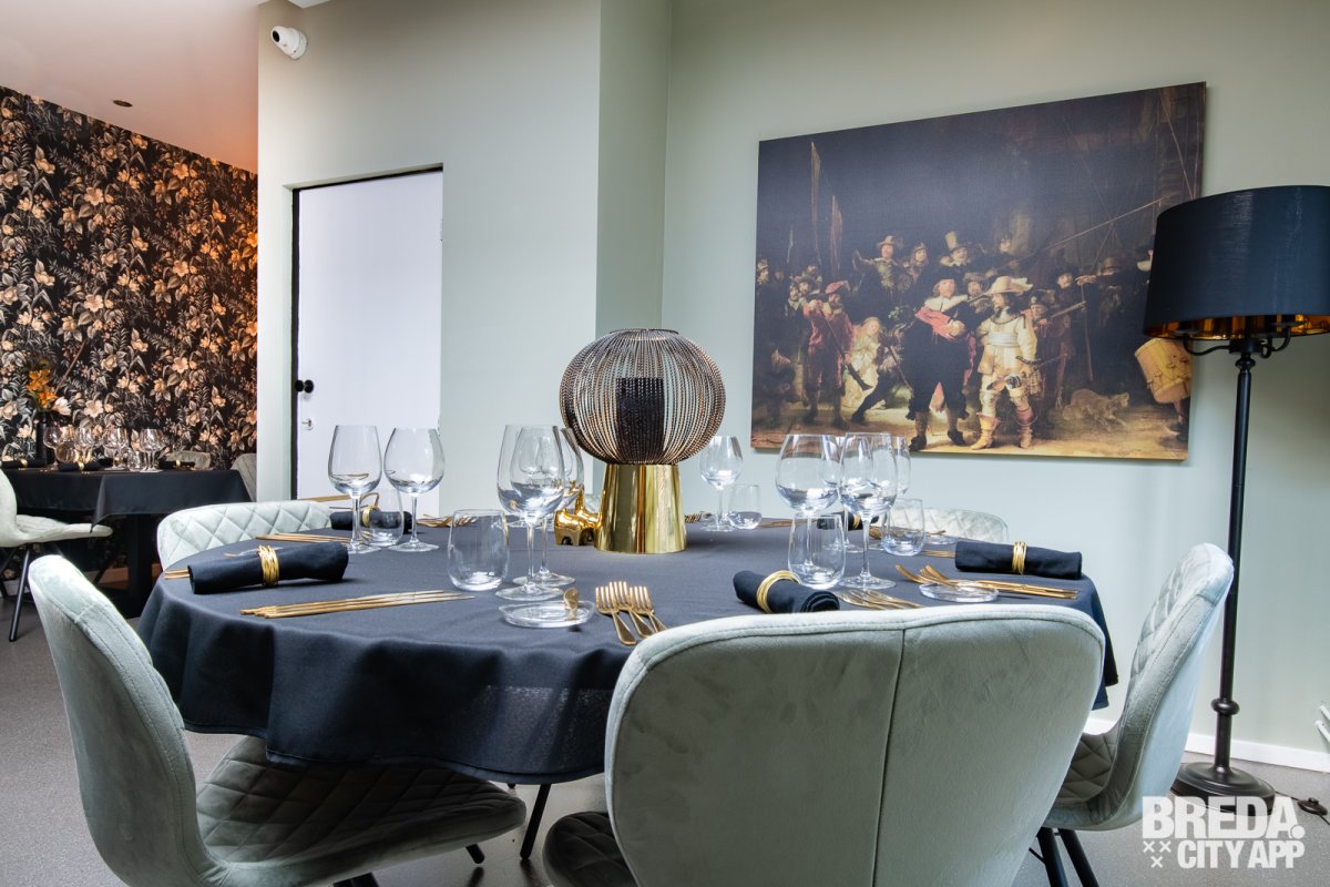 Het restaurant heeft een sjieke uitstraling uitstraling, waarbij de kleuren zwart, goud en mint groen staan centraal. Er zijn verschillende zitjes gecreëerd waardoor je zowel romantisch met z'n tweeën als met een groep kunt dineren. De tafels achterin de zaak hebben zelfs uitzicht op de open keuken.