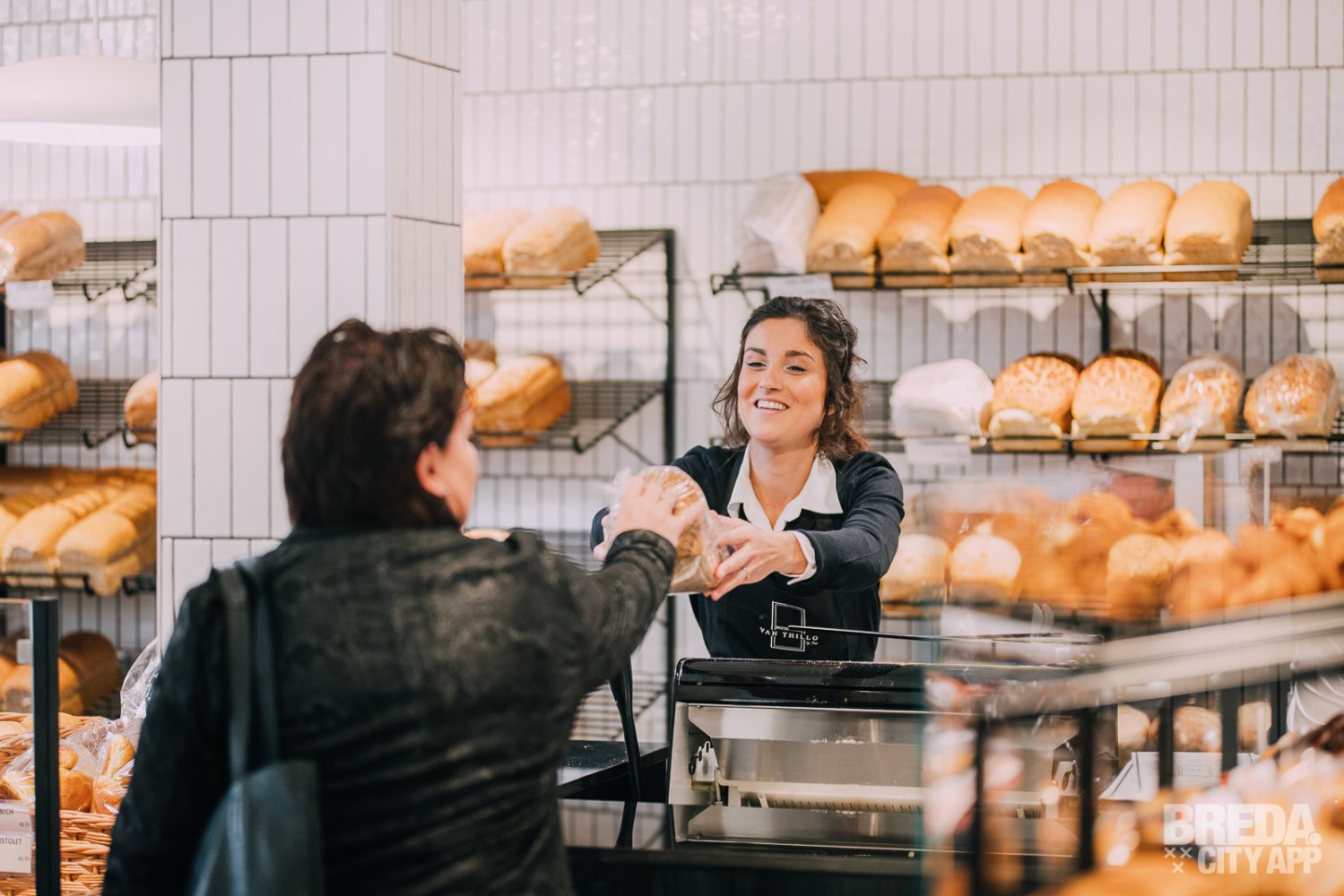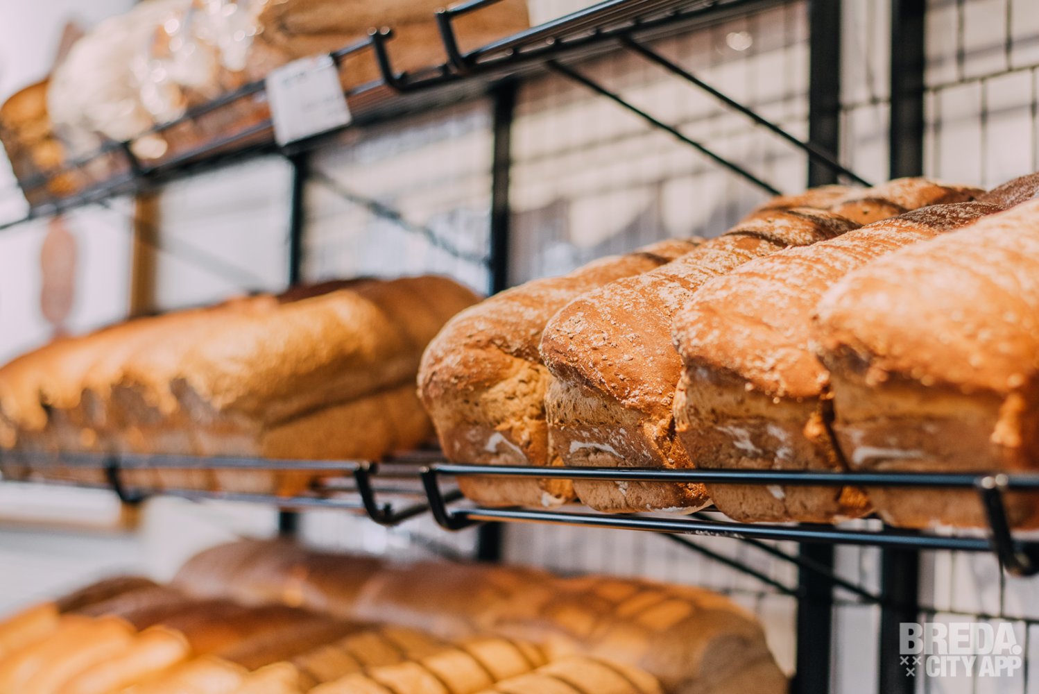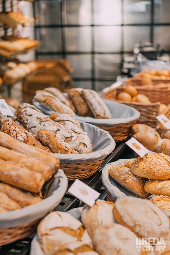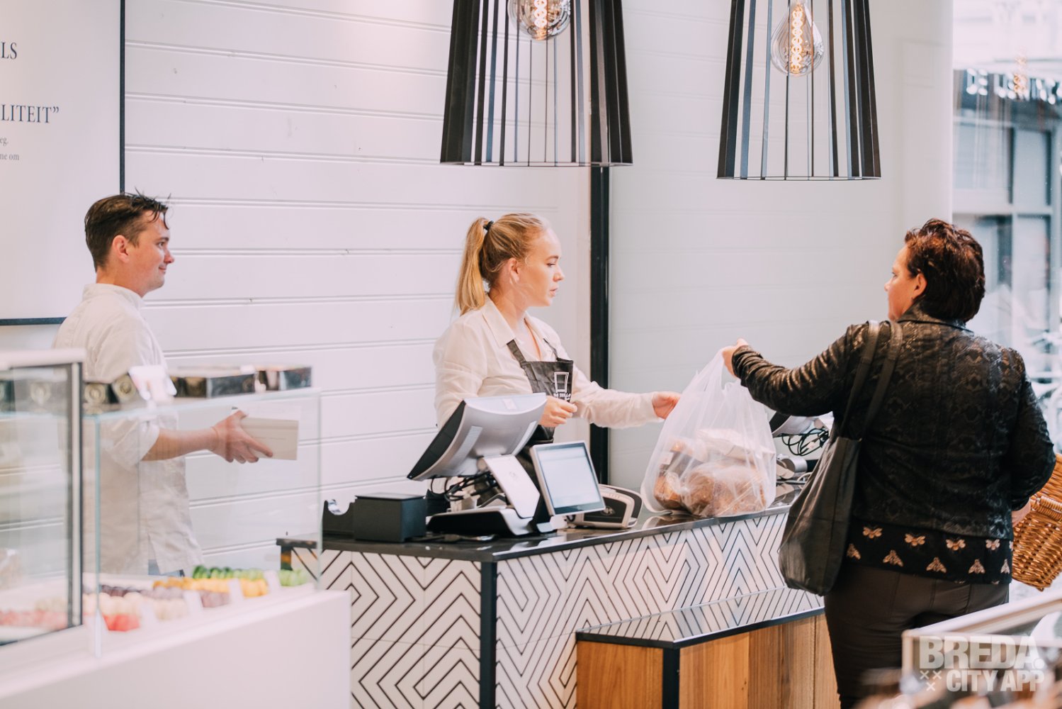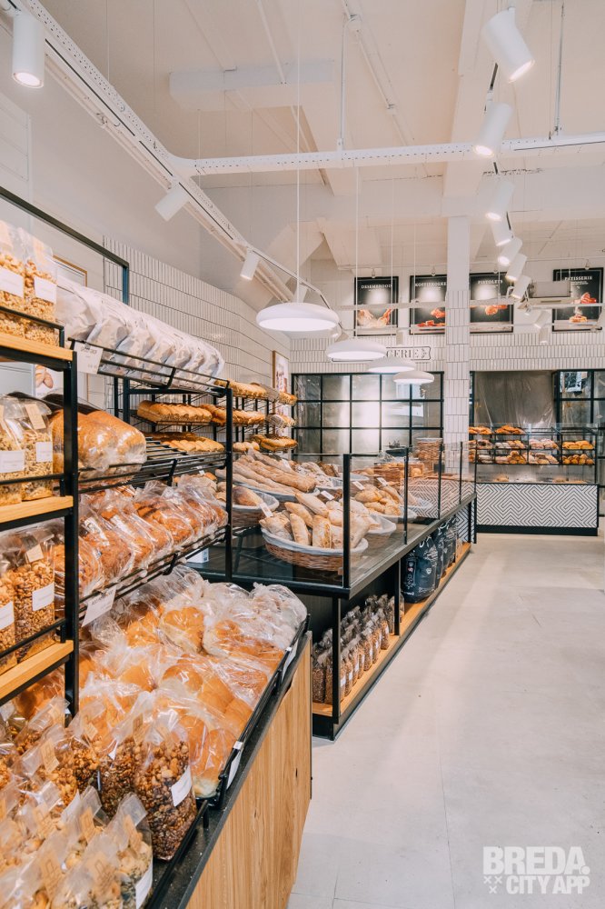 Bij binnenkomst wordt je verwelkomt door de geur van vers brood en heerlijke patisserie. De winkel heeft een moderne inrichting met veel zwart staal, hout en foto's van het ambacht.