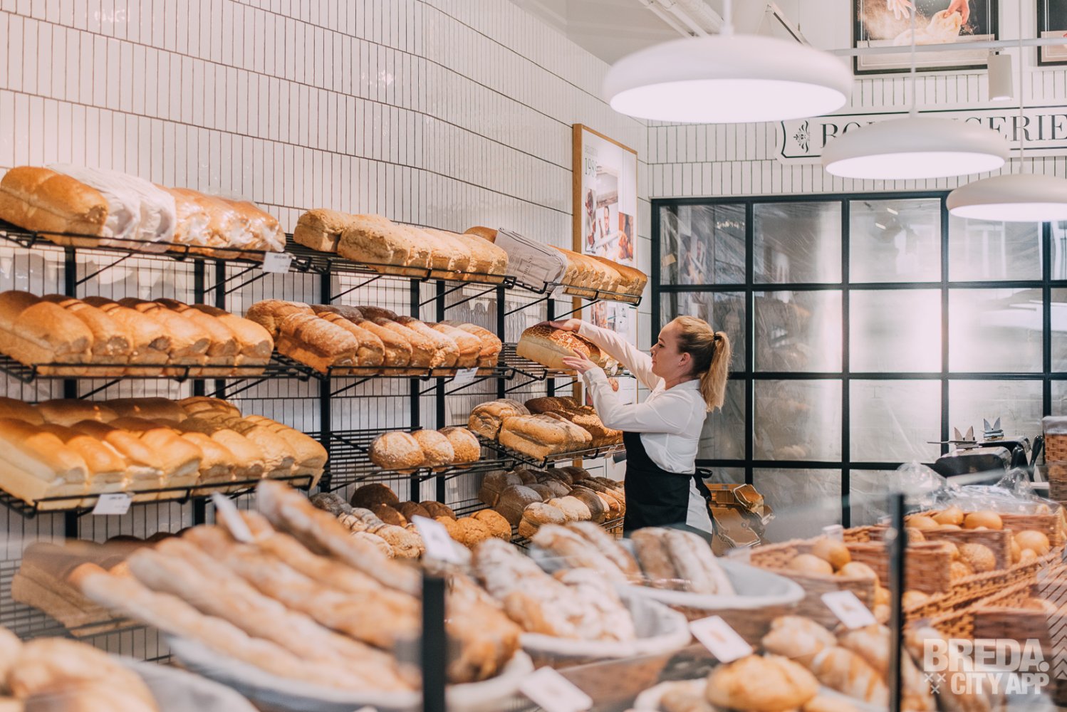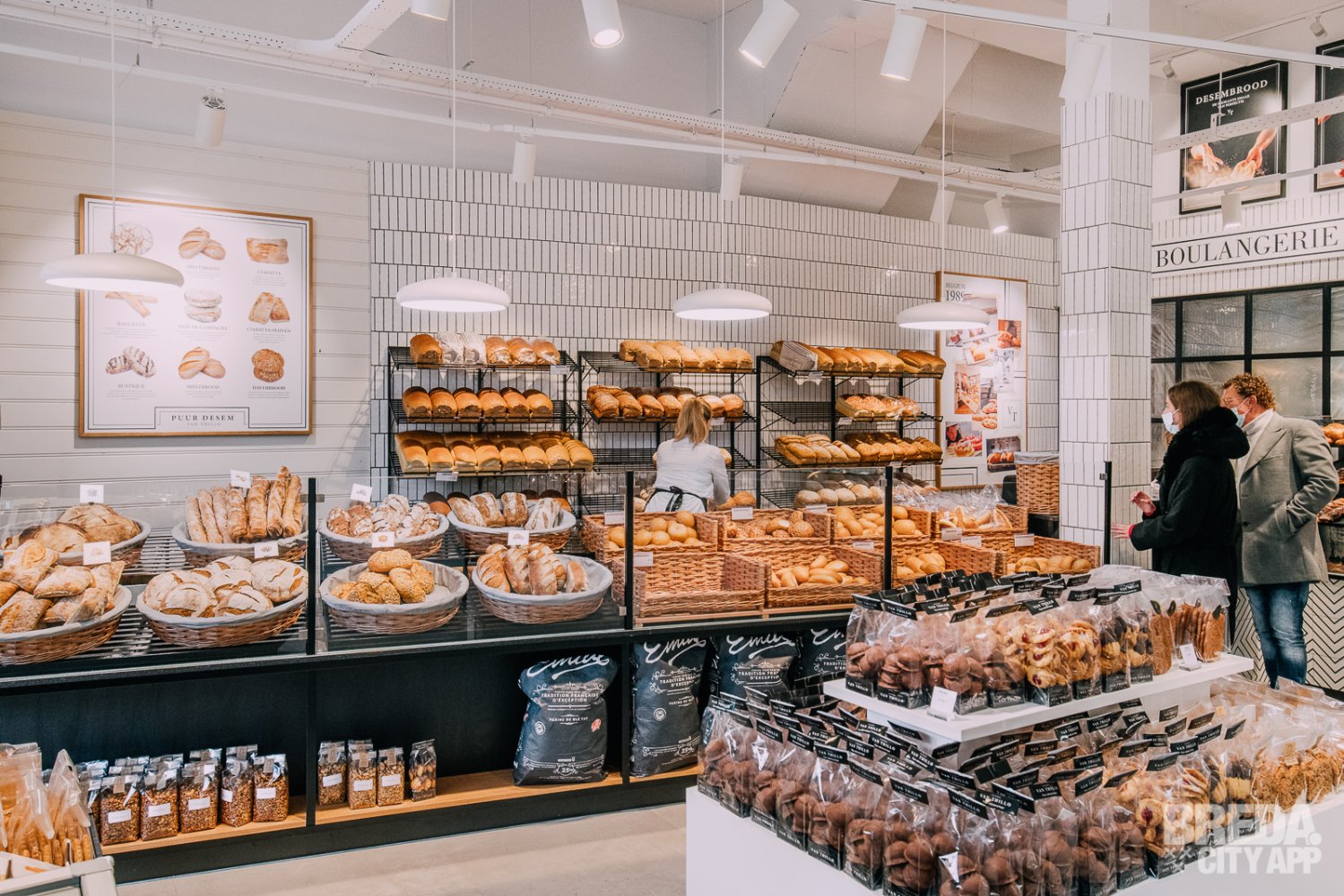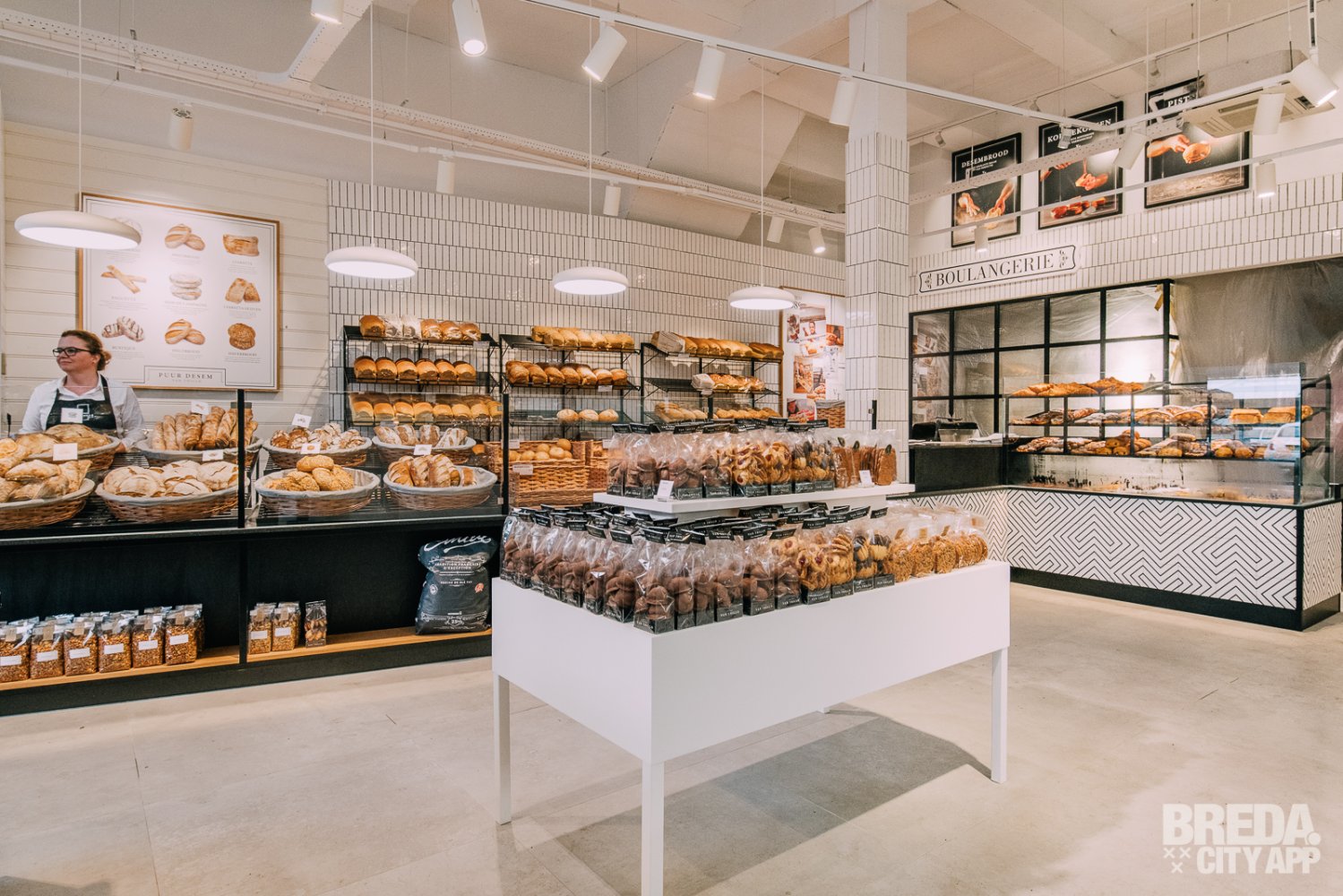 Aan de linkerkant bevind zich de boulangerie. Hier heb je keuze uit tientallen broden en broodjes. Een leuk detail is dat je het brood op twee verschillende diktes kunt laten snijden: de Nederlandse en de Belgische standaard.