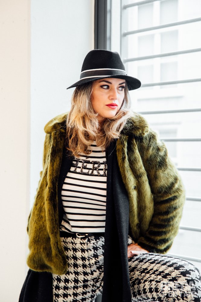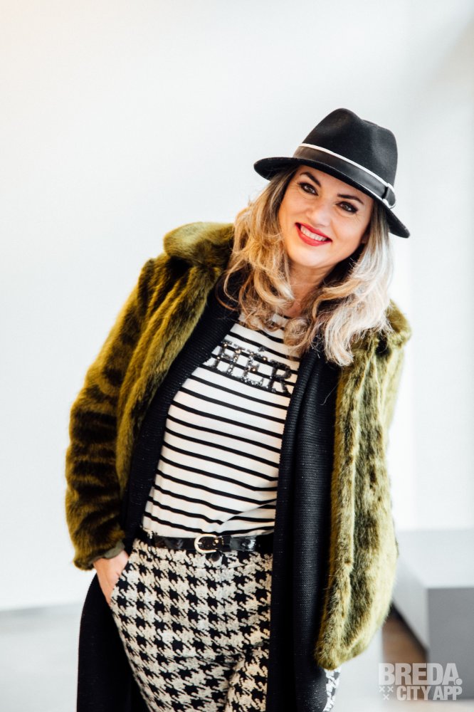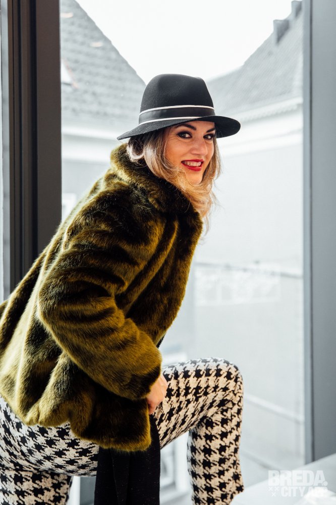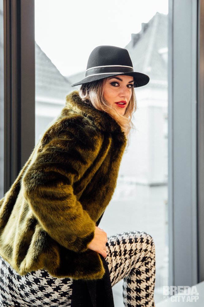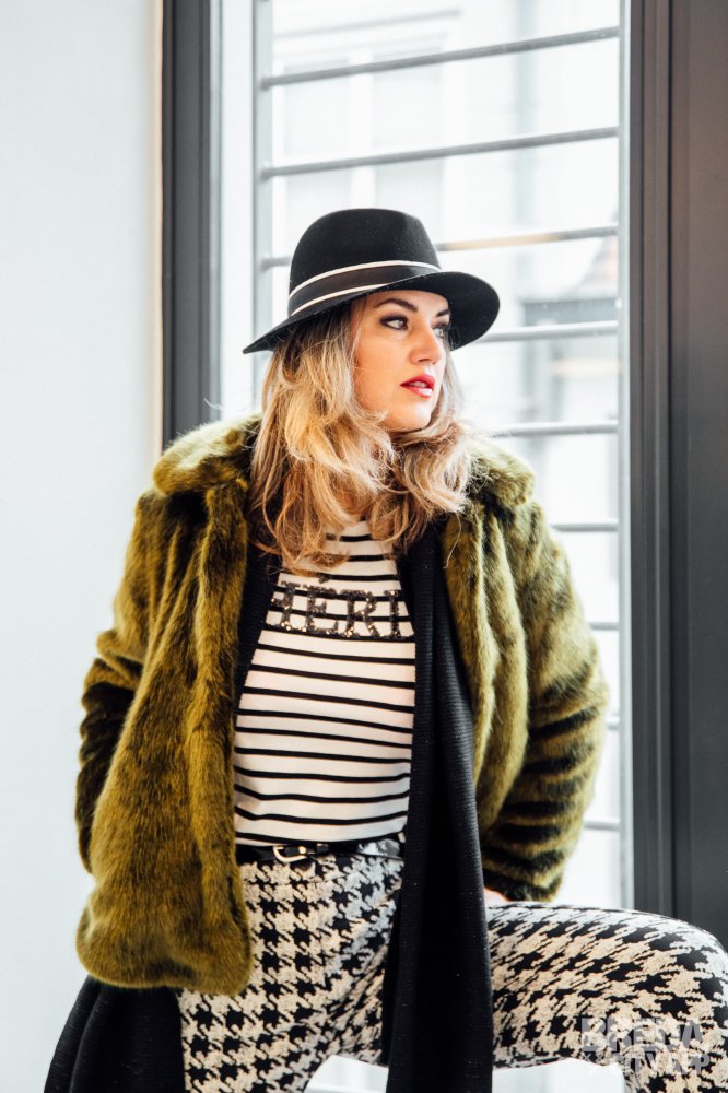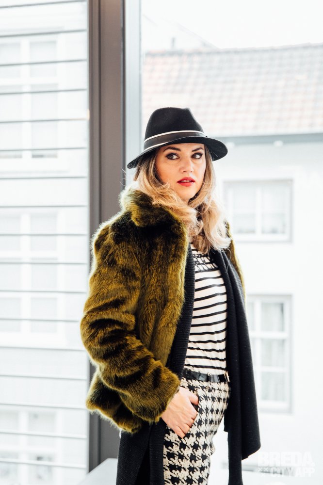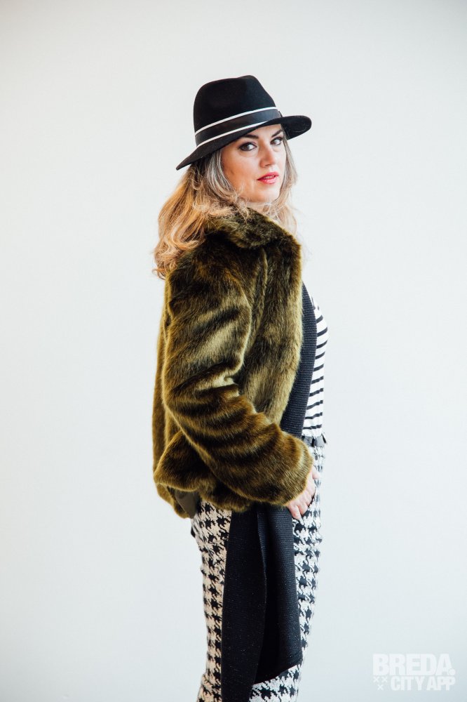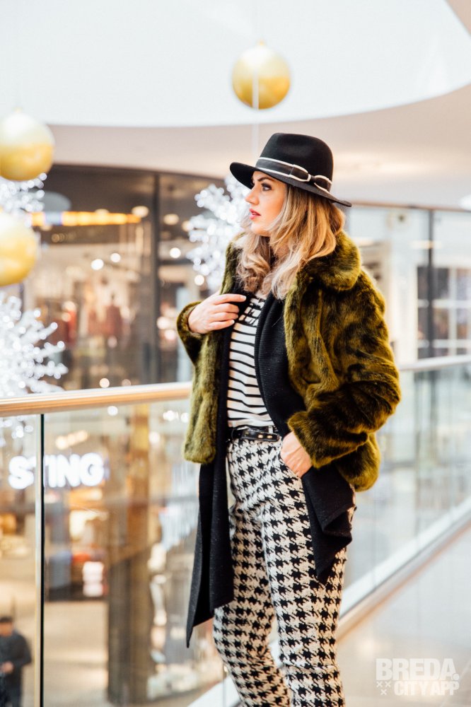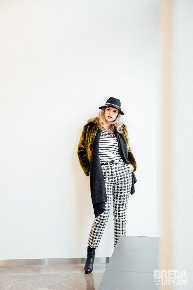 Aangekomen bij de Van Uffelen mode kiest Katalin voor een toffe broek met een Pied-de-Poule patroon. Dit patroon komt oorspronkelijk uit Schotland en geeft een chique uitstraling. Op deze broek draagt Katalin een gestreept t-shirt met lange mouwen. De opdruk met pailletten maakt het geheel nog wat feestelijker. Om ook buiten de deur stijlvol te verschijnen is deze outfit afgemaakt met een heerlijke furcoat. Niet alleen de stof is helemaal volgens de laatste trends, maar ook de groene kleur is super hip!