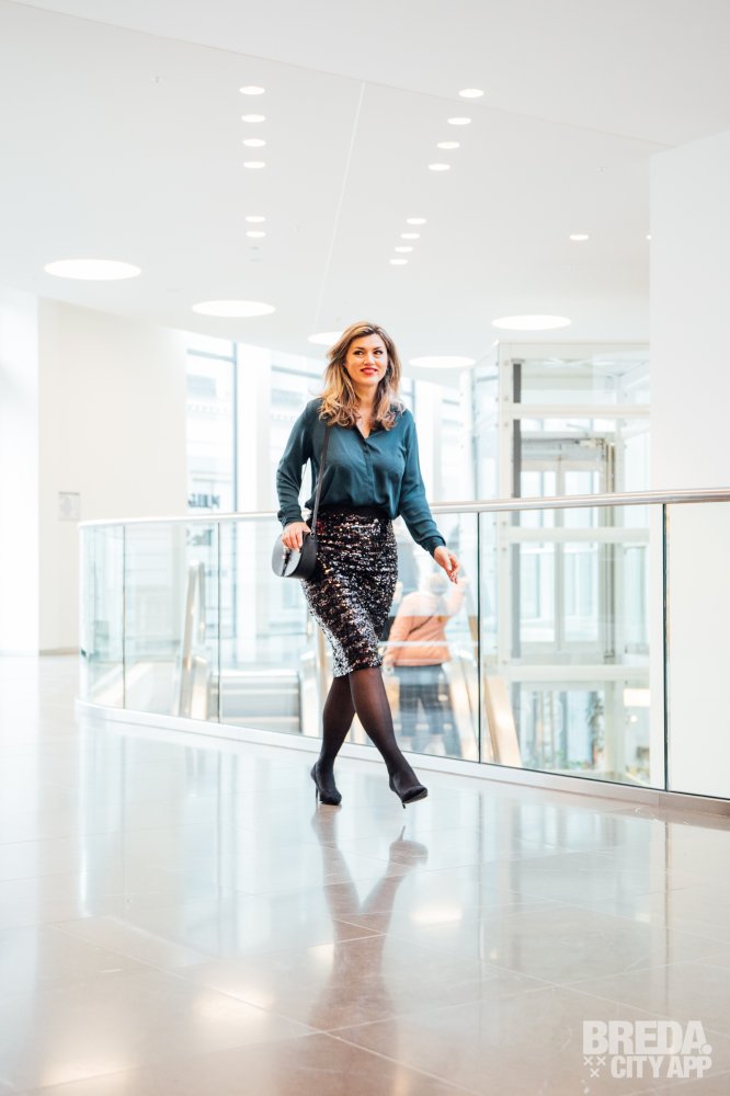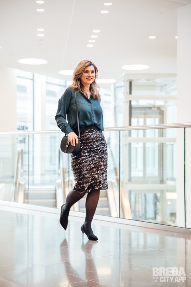 We gaan één deur verder, waar we bij S. Oliver deze outfit shoppen die zowel zakelijk als privé gedragen kan worden. De zwarte pantalon die Katalin draagt is stijlvol en chique, waardoor hij niet alleen geschikt is voor bijvoorbeeld een kerstdiner met vrienden of familie, maar ook tijdens een netwerkborrel of zakelijke bijeenkomst gedragen kan worden. In combinatie met de glittertop krijgt de outfit echt een feestelijk tintje.