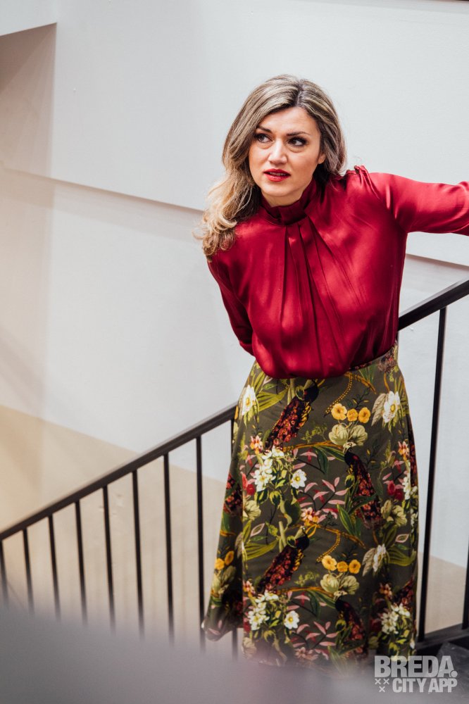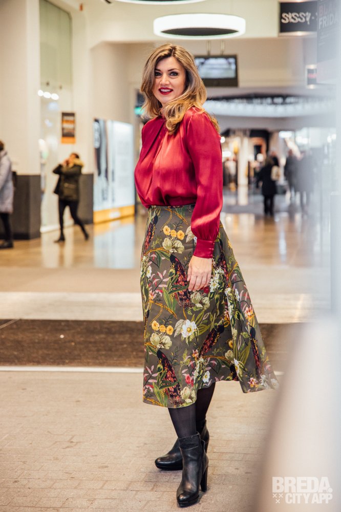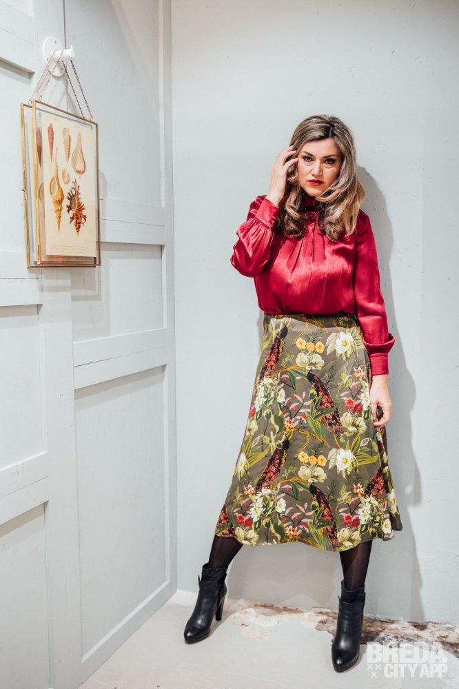 Aangekomen bij de onlangs geopende Sissy-Boy zijn wij heel erg benieuwd wat er voor ons is klaargelegd. Katalin komt het pashokje uitgelopen in een súper toffe klokkende midirok met all over print. De rok heeft een blinde ritssluiting aan de achterkant. Deze rok komt het beste tot zijn recht met een effen blouse. Katalin kiest voor een prachtige satijnen blouse met opstaande kraag, plooien voor, lange mouwen met manchet én een knoopsluiting in de hals. De blouse heeft een los vallende fit. De rode kleur van de blouse zie je ook terug in de rok. Wij zijn hélemaal weg van deze outfit! Wat vinden jullie?