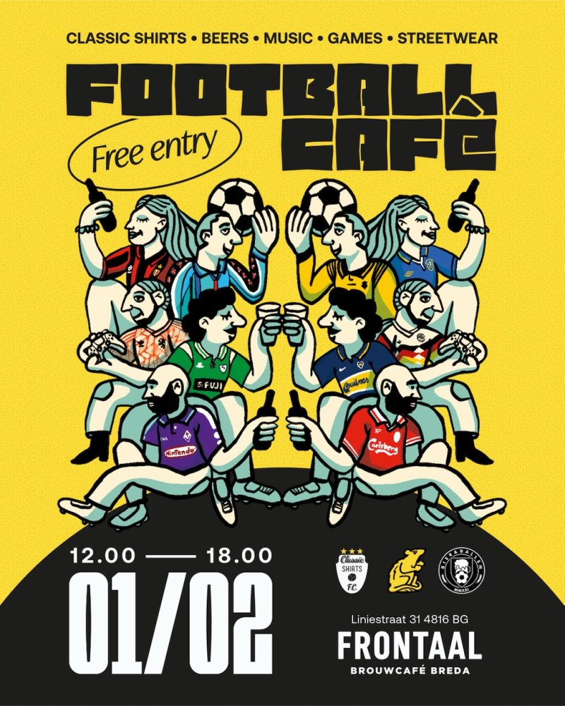 Op zondag 1 februari wordt Frontaal Brouwcafé aan de Liniestraat omgetoverd tot het walhalla voor liefhebbers van voetbalcultuur. Tijdens deze editie van 'Football Café' slaan diverse smaakmakers de handen ineen. Naast bekende namen als Classic Shirts F.C., Brouwerij Bier & Ballen en Rath Streetwear, sluiten er nog meer deelnemers aan voor een middag vol vintage shirts, fashion, games en gezelligheid.