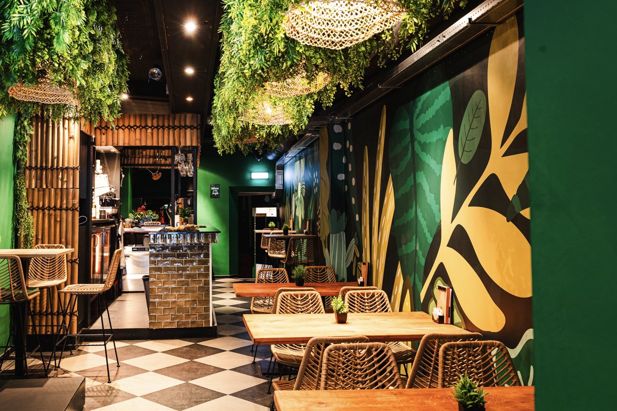 Zodra je binnenstapt bij Wings Paradise waan je je even buiten Nederland. Het interieur ademt een relaxte island vibe, met veel groen, warme houttinten, exotische details en sfeervolle verlichting. De tropische aankleding zorgt voor een ongedwongen, zomerse sfeer waarin je moeiteloos blijft hangen – of je nu komt voor een diner of een gezellige borrel.