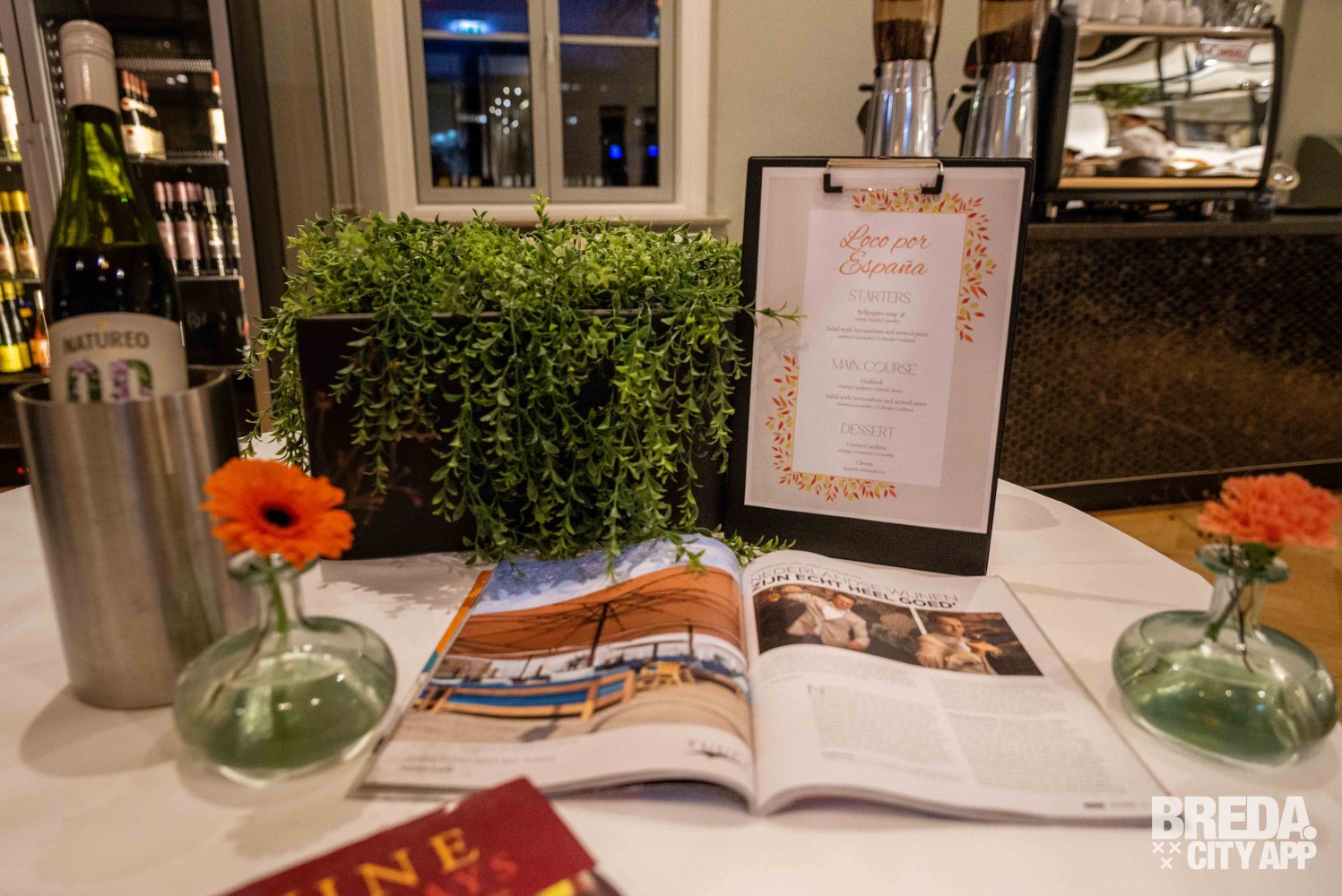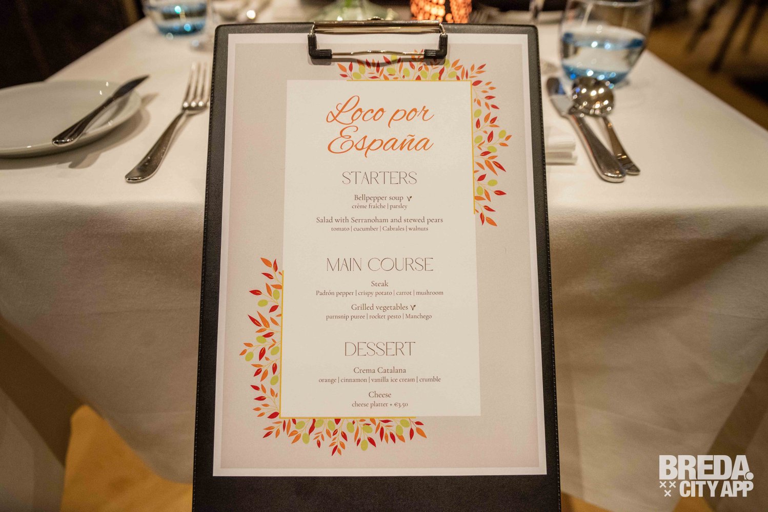 We worden vriendelijk verwelkomd door een eerstejaars studente die ons het concept toelicht: elke week is er een nieuw menu bedacht door de tweedejaars managers en deze week is het thema Spaans: muy bien! Het menu is een driegangenmenu en er is keuze tussen twee verschillende gerechten per gang, waarbij één van de keuzes een vegetarische optie is.