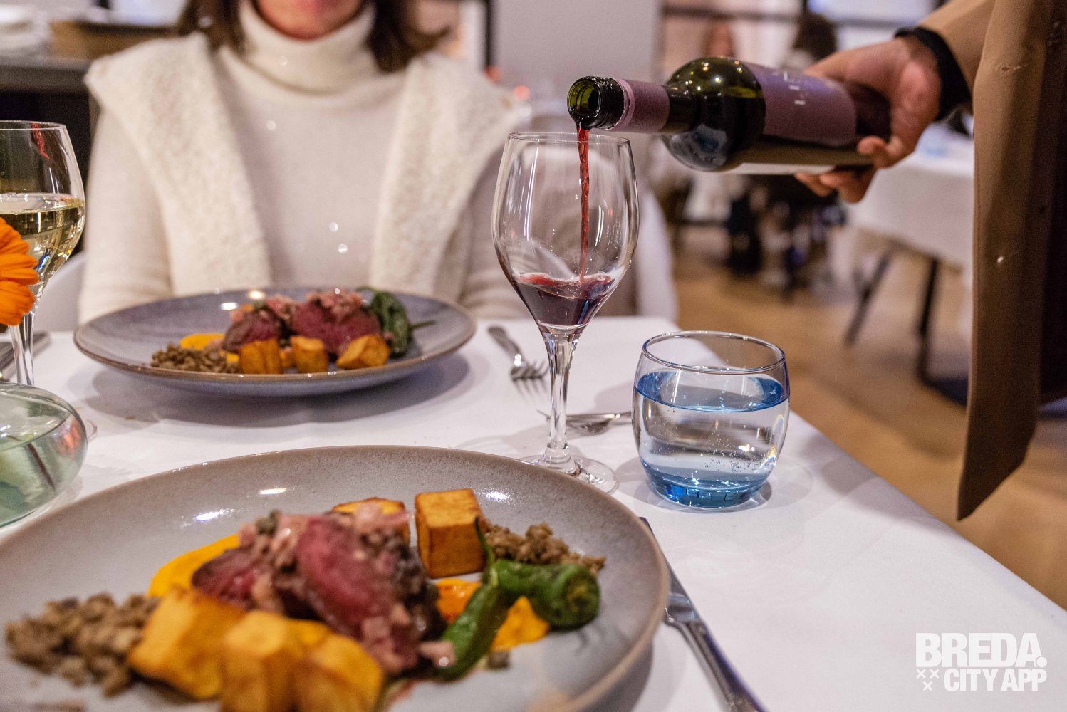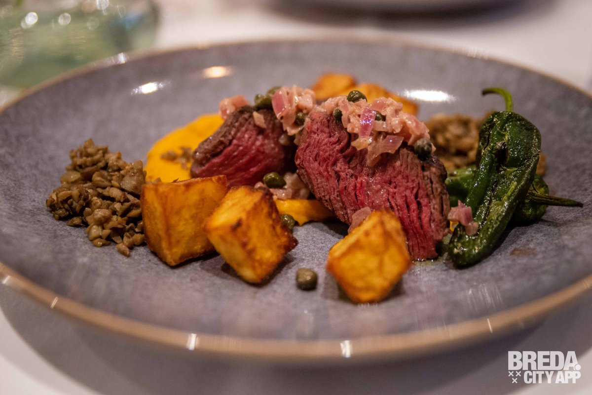 Ondertussen worden de hoofdgerechten opgemaakt en nemen we weer plaats aan tafel. We hebben gekozen voor de steak en hier wordt uiteraard een rode wijn bij geserveerd: wederom een Argentijnse La Linda, maar ditmaal een Malbec uit 2020. De steak wordt geserveerd met Padrón peppers (typische Spaanse groene pepertjes), knapperige aardappelpartjes, wortelpuree, champignoncrumble, sjalotjes en kappertjes. De garing van de steak is perfect en de producten zijn puur en ontzettend smaakvol. Genieten!